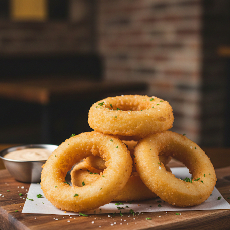 Orden individual de dedos y cebolla con porción de papas naturales a la francesa fritas y salsa con aderezo ranch.
