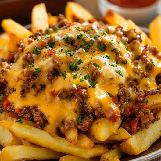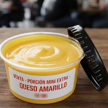 Orden individual de porción de papas naturales a la francesa fritas con cane y queso de amarillo.