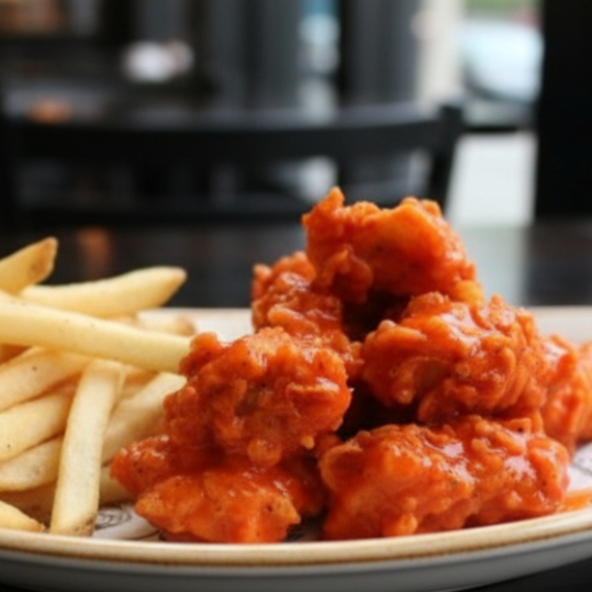 Un kilo crudo de boneless cocidos, fritos y dorados incluye; pequeña porción de papas naturales a la francesa fritas.