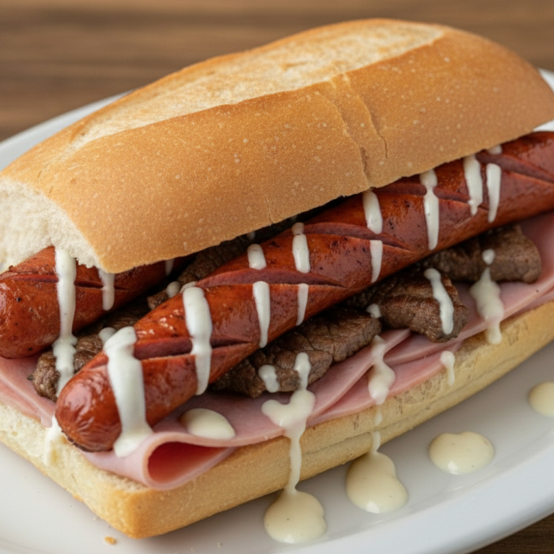 Pan de telera con carne arrachera, salchicha, y jamón, aderezo ranch incluye; pequeña porción de papas naturales a la francesa fritas.