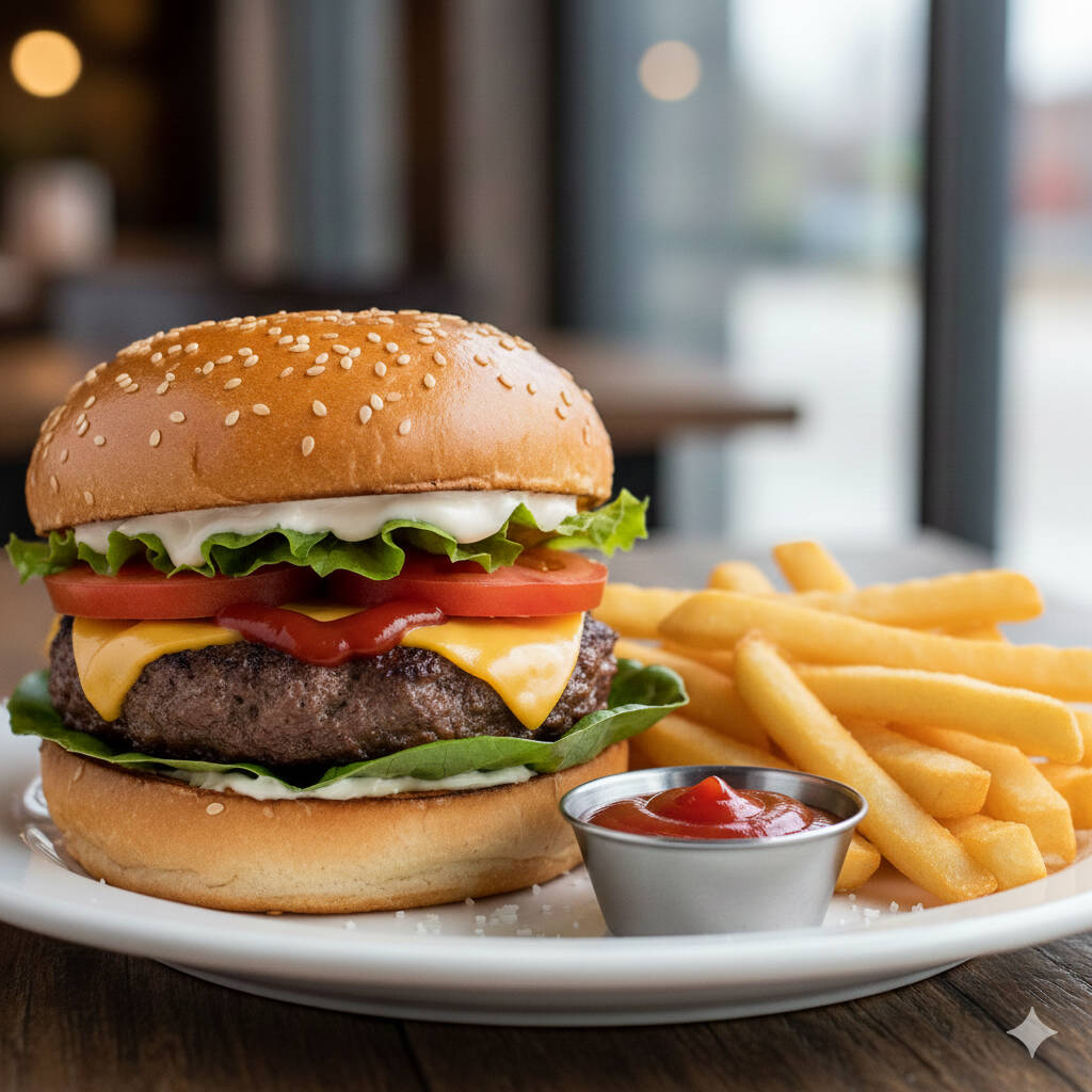 Pan de ajonjolí con carne sirloin, con queso amarillo, tómate, lechuga, queso amarillo, mayonesa, cátsup incluye; pequeña porción de papas naturales a la francesa fritas.