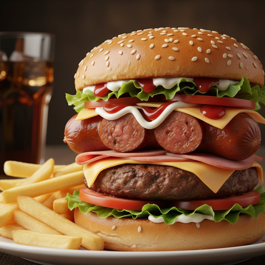 Pan de ajonjolí con carne y salchichas, con queso amarillo, tómate, lechuga, queso amarillo, mayonesa, cátsup incluye; pequeña porción de papas naturales a la francesa fritas.