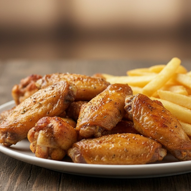 Un kilo de alitas crudas, doradas, freidas y fritas incluye; pequeña porción de papas naturales a la francesa fritas.