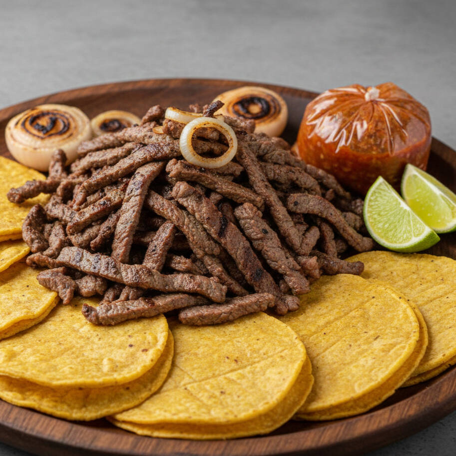 Un kilo crudo de carnde de arracherra cocida a la plancha con 10 tortillas, salsa, limones y cebolla asada.
