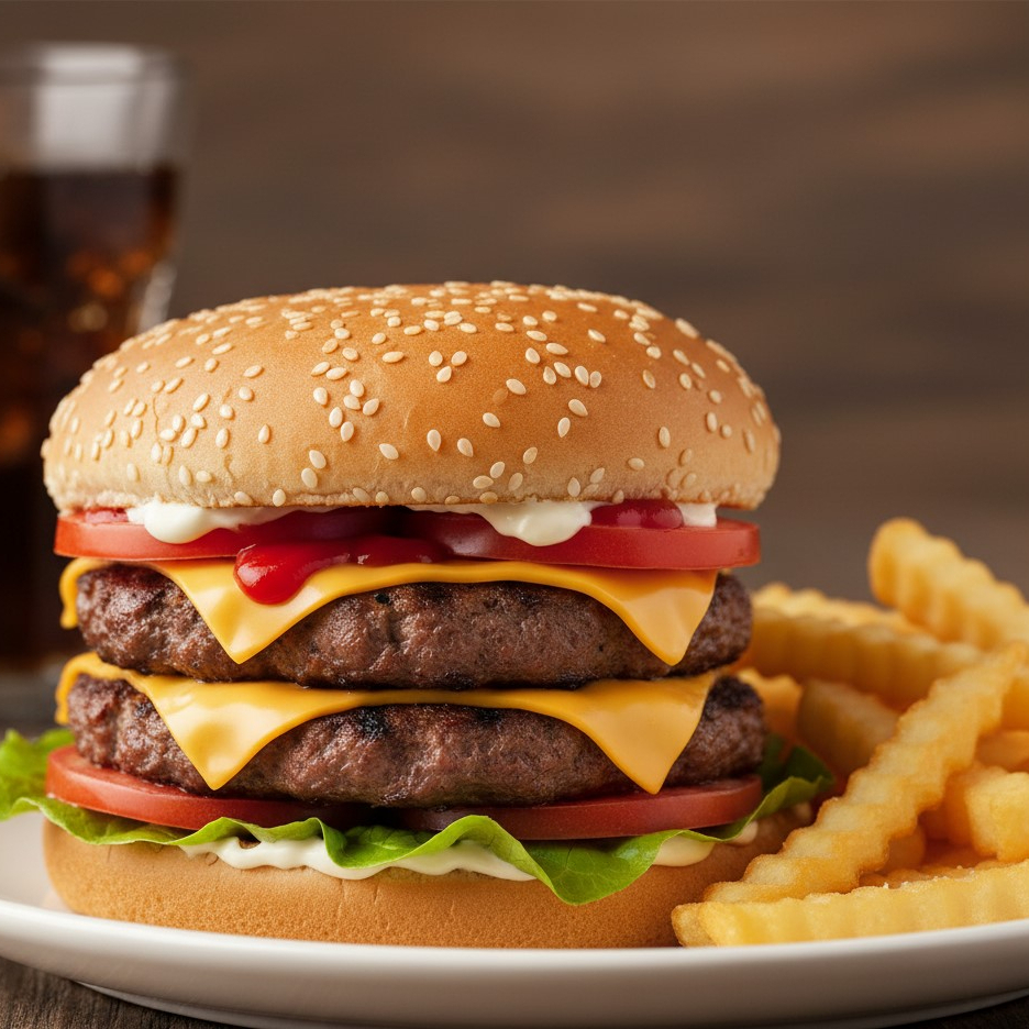 Pan de ajonjolí con 2 carnes, con queso amarillo, tómate, lechuga, queso amarillo, mayonesa, cátsup incluye; pequeña porción de papas naturales a la francesa fritas.
