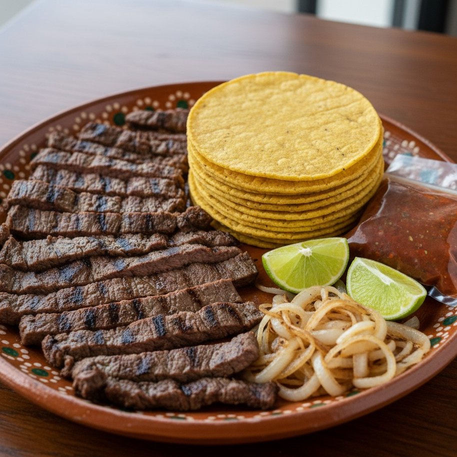 Un kilo crudo de carne de bistec cocida a la plancha con 10 tortillas, salsa, limones y cebolla asada.bi