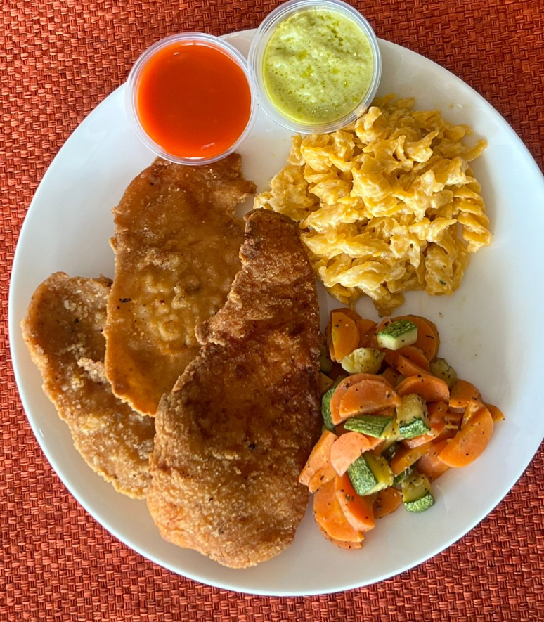 Tiritas de pechuga de pollo empanizado acompañado de dos guarniciones a escoger.