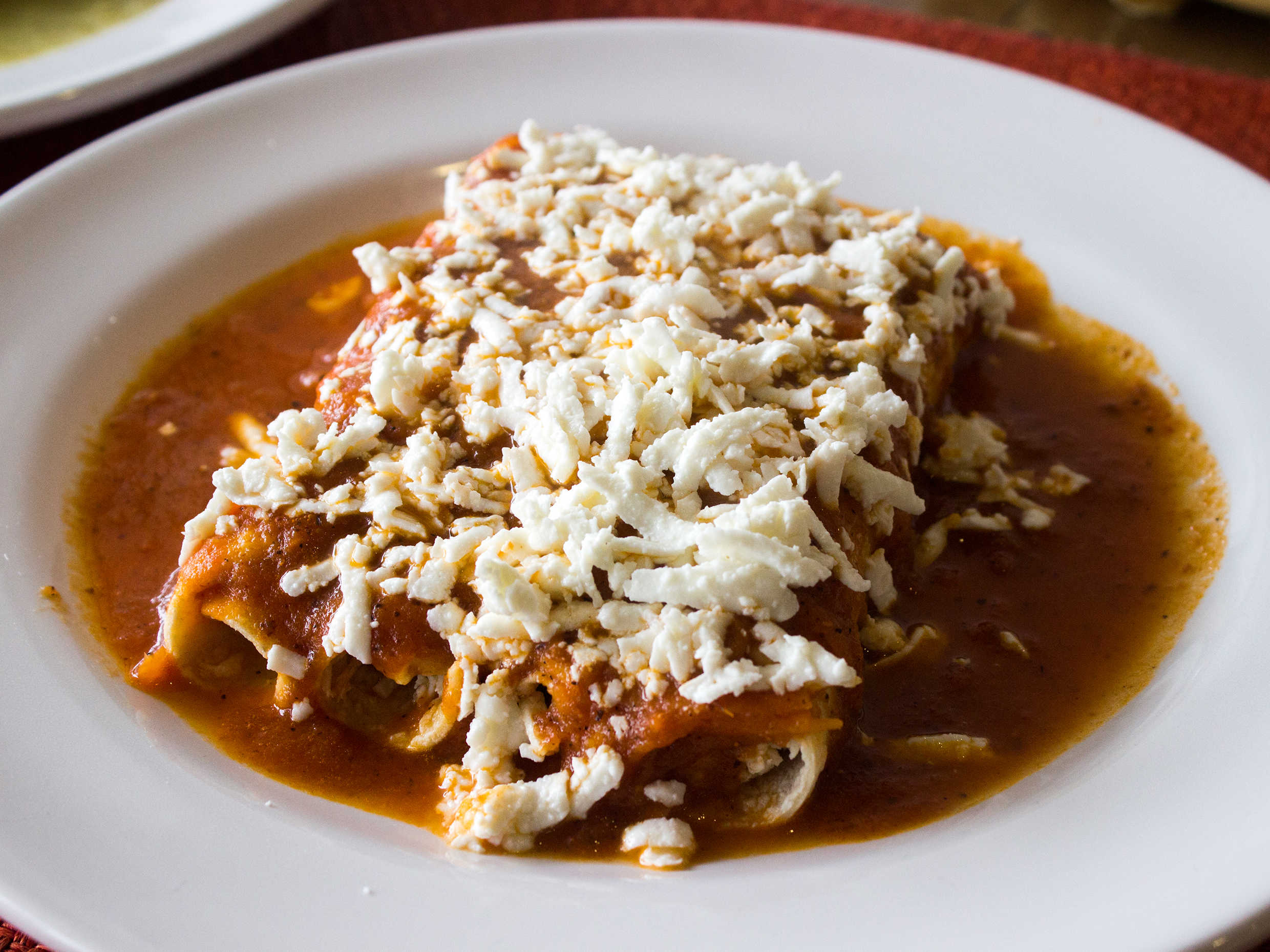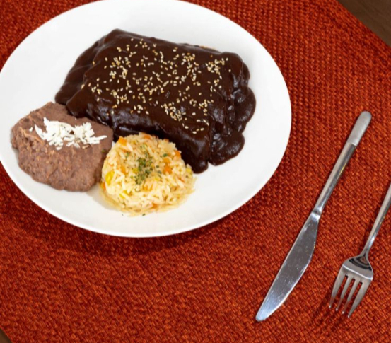 Rellenas de pechuga de pollo deshebrado, bañadas en mole.