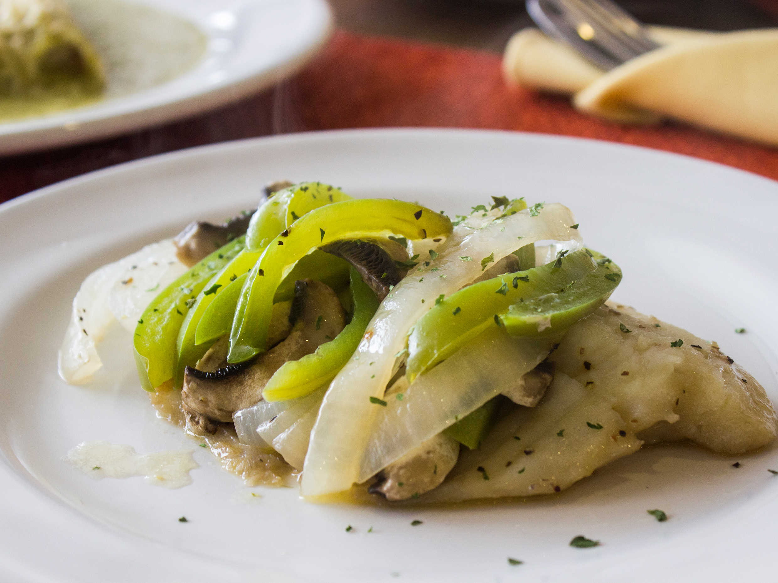 Filete de pescado cocinado en vino blanco al vapor, acompañado de julianas de cebolla,zanahoria y champiñones.