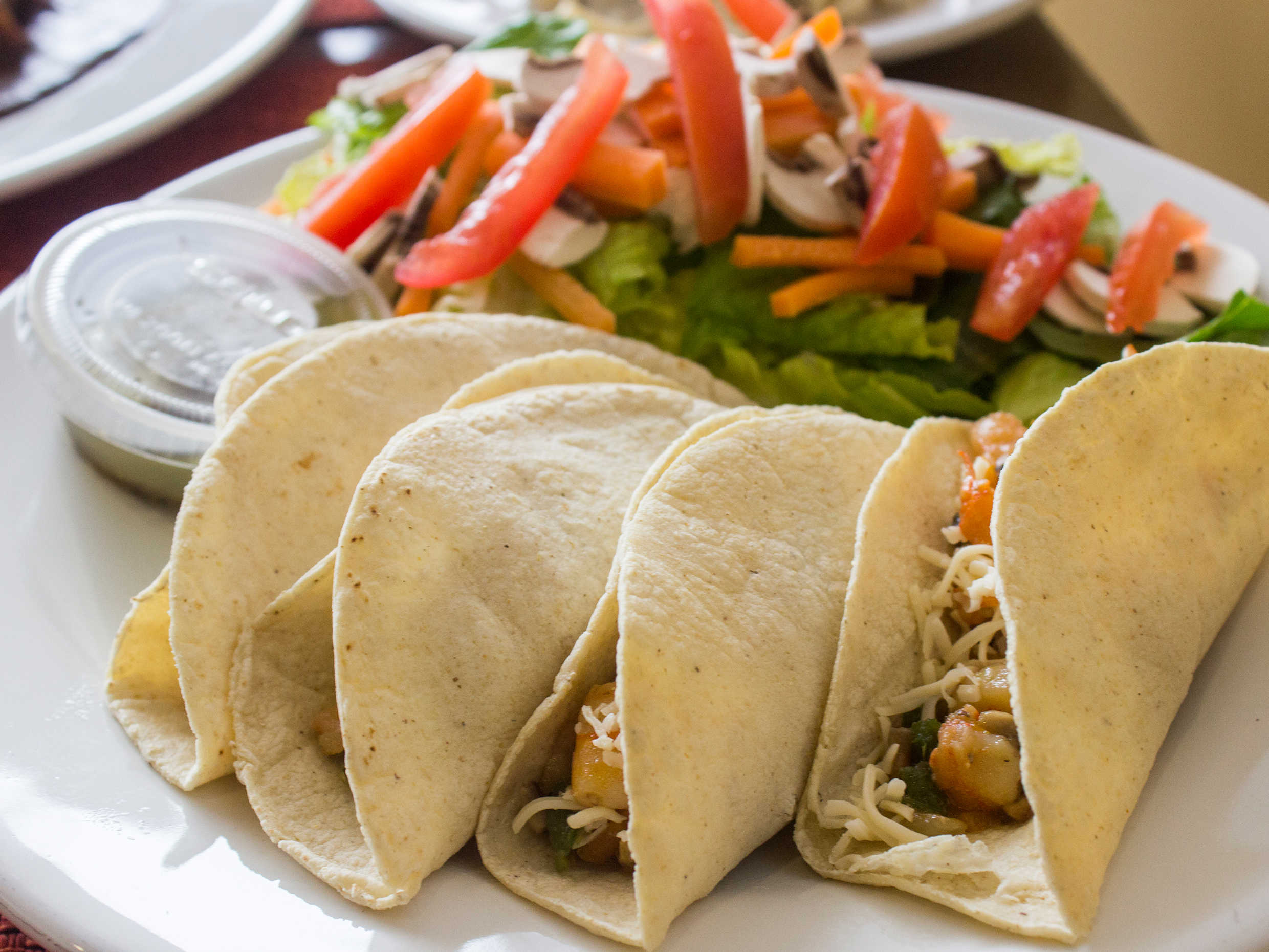 Tacos rellenos de camarón. Acompañado de ensalada mixta.