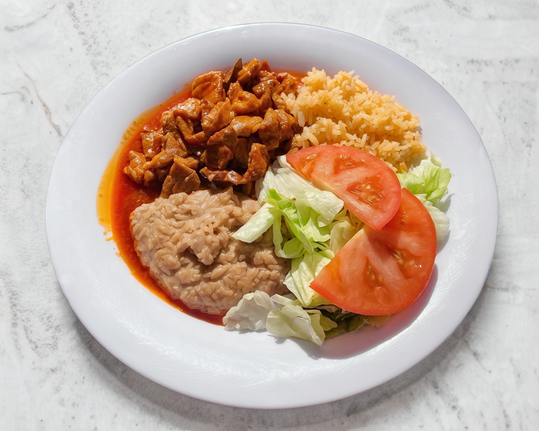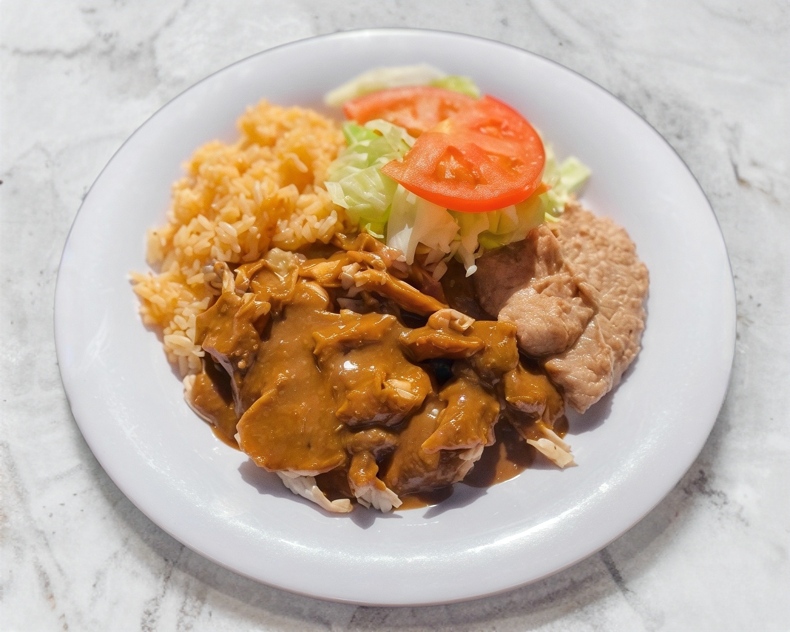 Delicioso pollo en mole acompañada de 2 guarniciones, incluye salsa y tortillas.