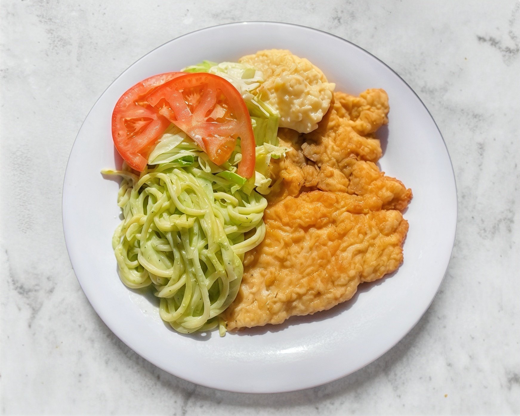 Deliciosa milanesa de pollo acompañada de 2 guarniciones, incluye salsa y tortillas.