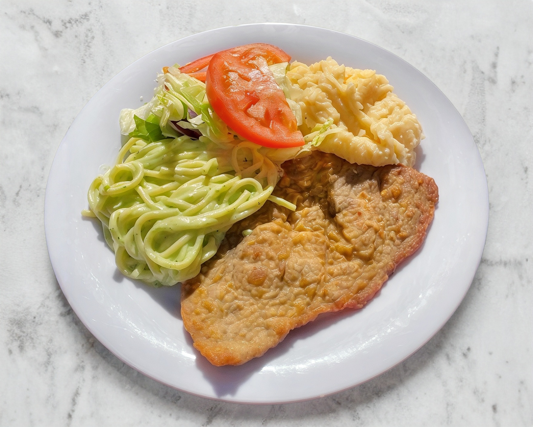 Deliciosa milanesa de res acompañada de 2 guarniciones, incluye salsa y tortillas.