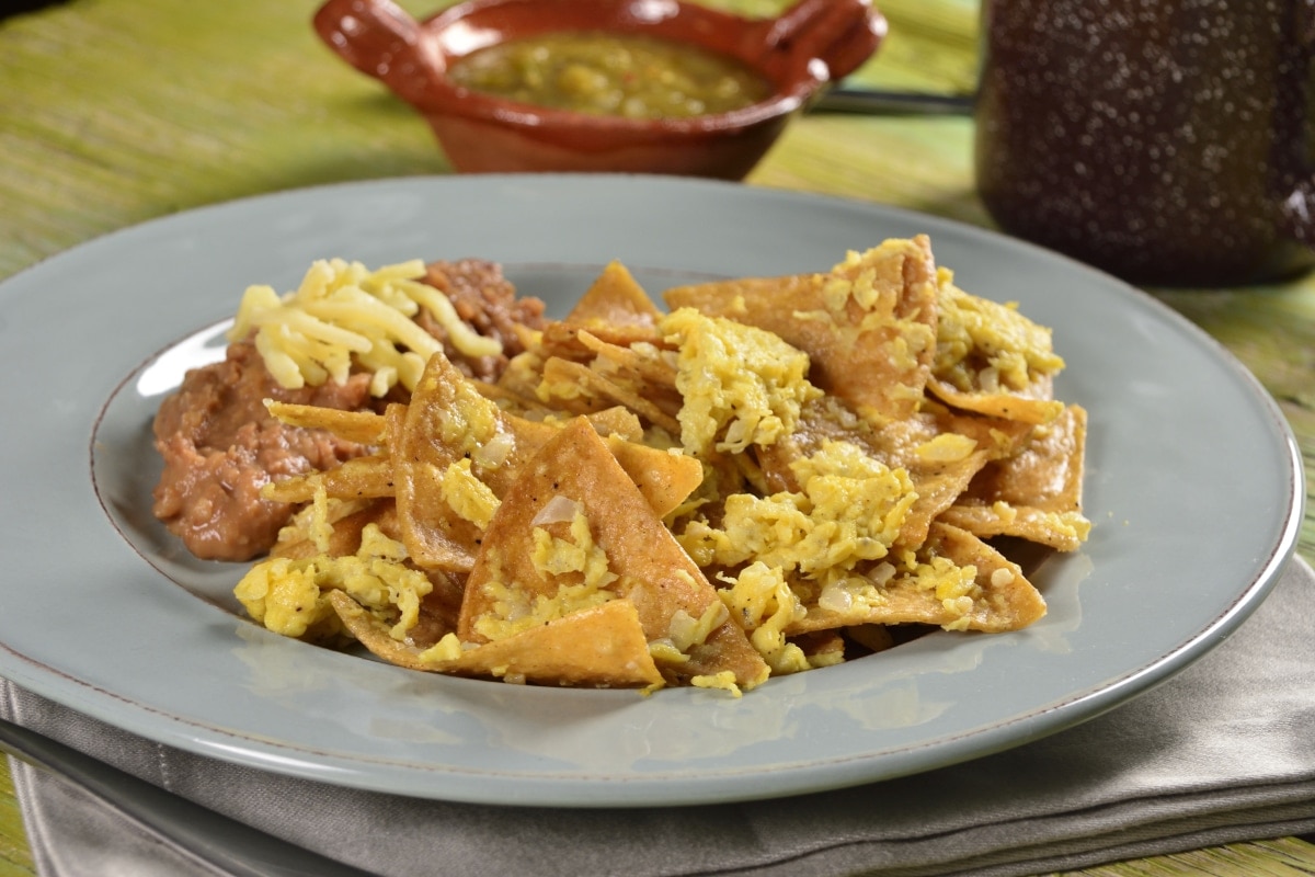 Tortillas doradas, bañadas en salsa verde, queso, crema, cebolla, acompañados con frijoles. agrega extra de pollo o huevo.