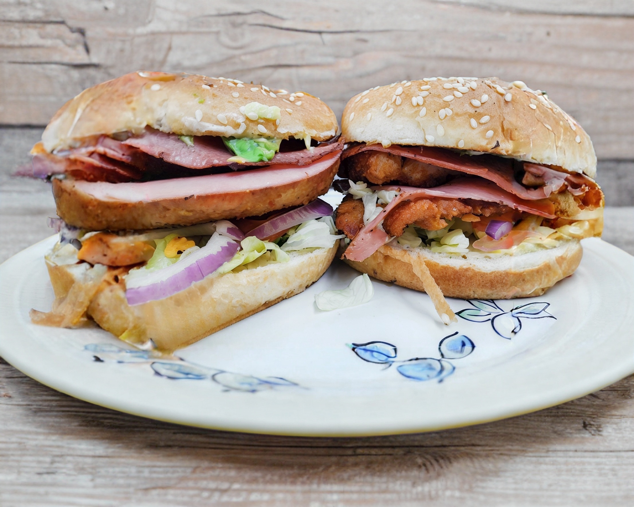 Milanesa de pollo 100 gr., jamón, queso tipo americano, queso Oaxaca, jitomate, cebolla, lechuga, mayonesa y mostaza, aguacate, cátsup, chiles en vinagre y una cama de papas a la francesa naturales.