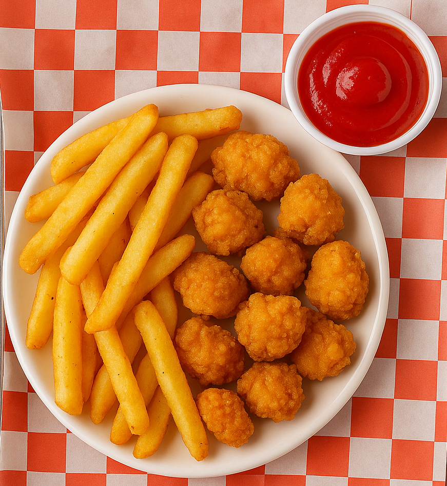 Mini versión de boneless. 150 gr de trocitos de pechuga de pollo empanizadas, incluye papas y bebida de 400 ml.