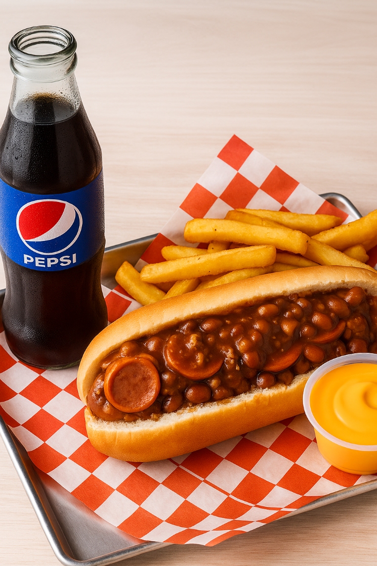 GoDogo chico relleno con chilidog casero, incluye papas y bebida de 400 ml.