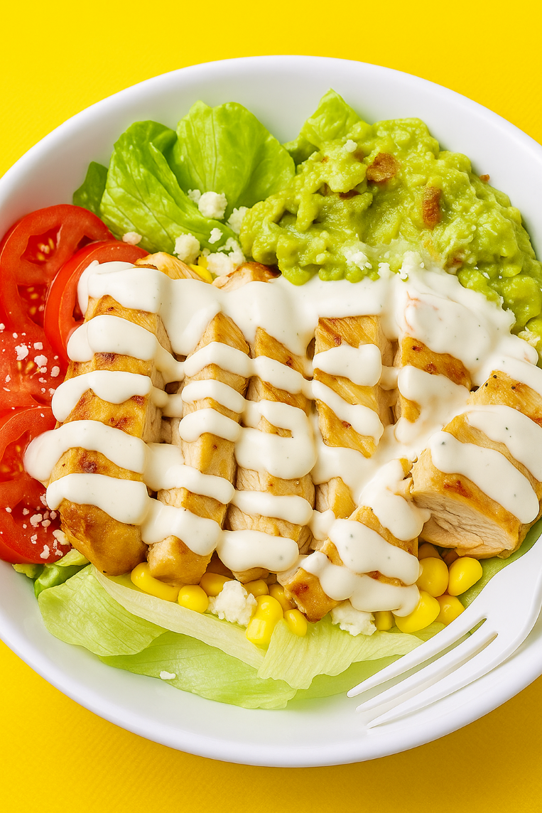 Ensalada de lechuga, con pollo a la plancha, tomate, elote, zanahoria, queso panela y guacamole