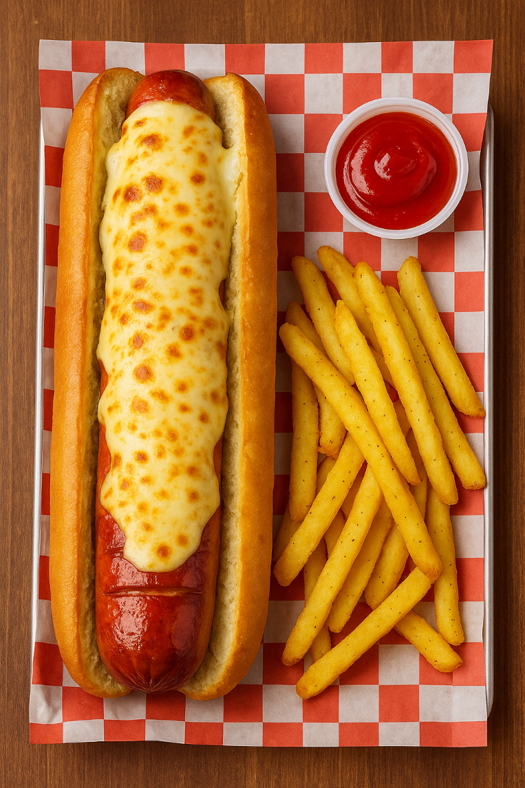 Salchicha de pavo, y queso gouda derretido por encima, acompañado con papas.