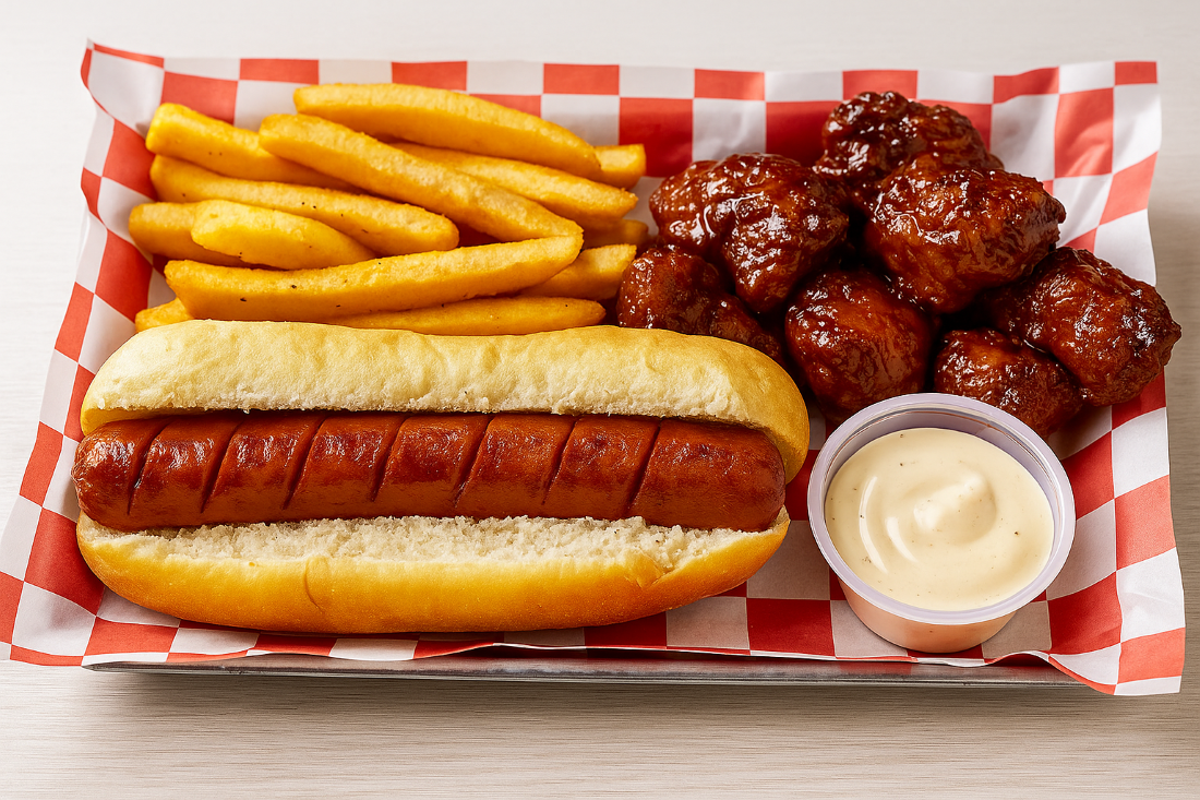GoDogo chico con salchicha de pavo, recargado con boneless, incluye papas y bebida de 400 ml.