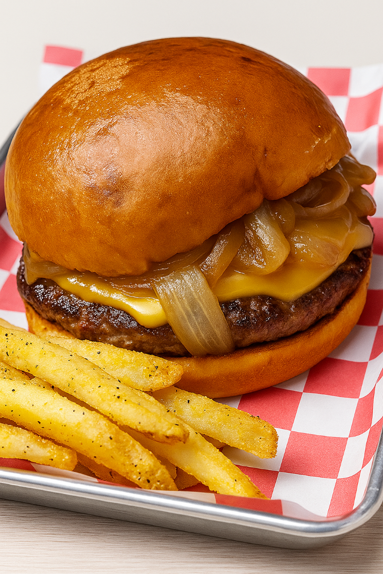 220 gr de carne de res + doble queso + cebolla caramelizada + pepinillios + catsup + mayonesa + papas a la francesa