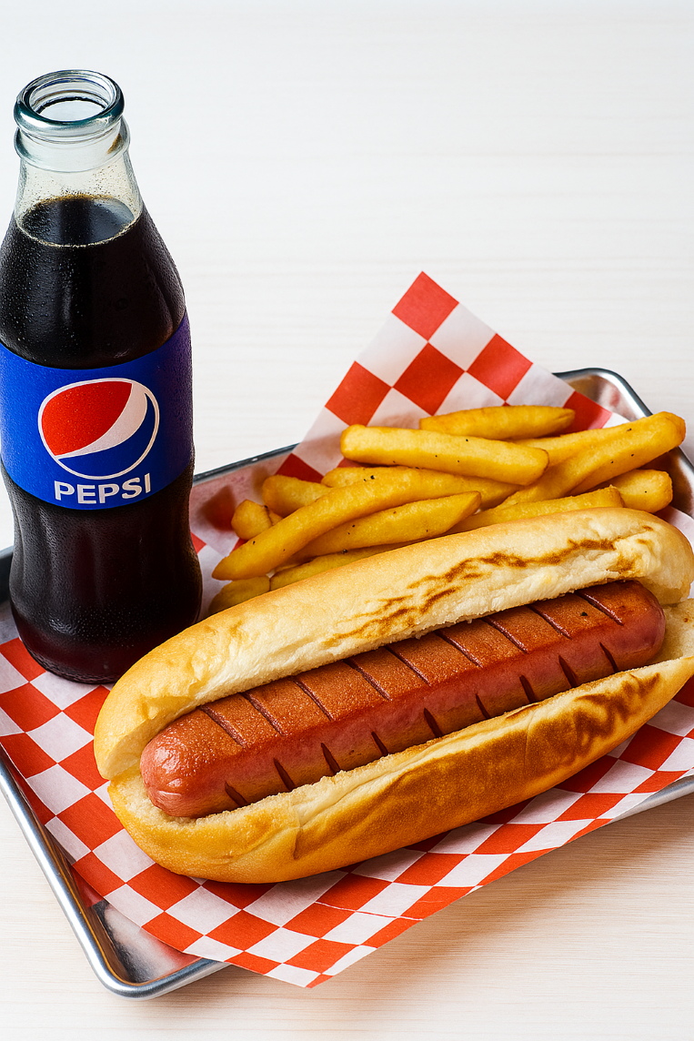 GoDogo chico con salchicha de pavo, incluye papas y bebida de 400 ml.