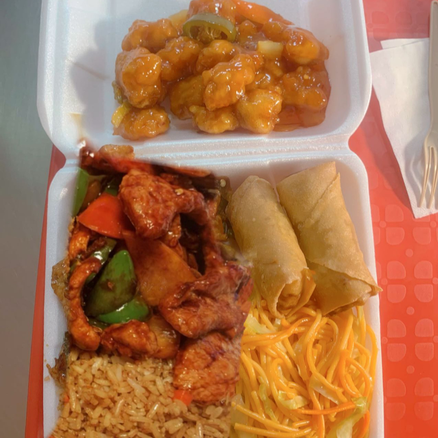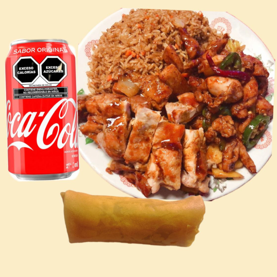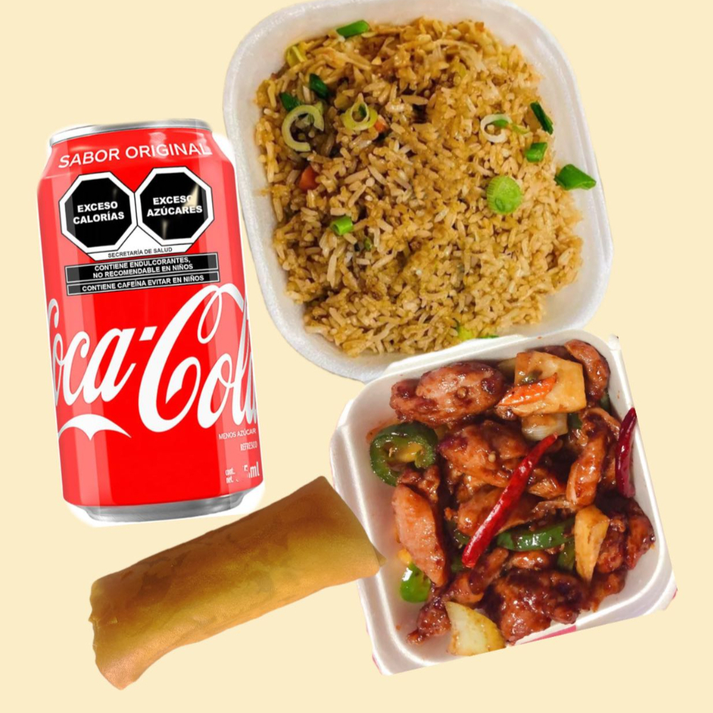 1 Rollo primavera con 2 guisos a escoger,arroz ,pasta o mixto+bebidas