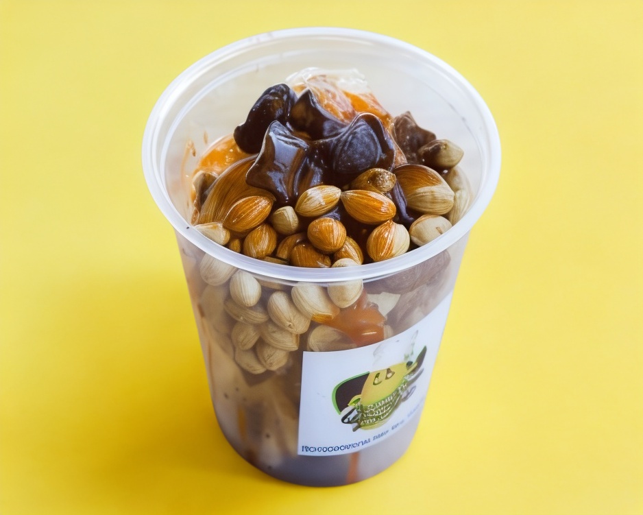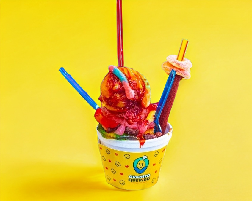 Nieve estilo jalisco servida en vaso térmico tipo unicel de 12 oz con tapa acompañada con gomitas y chamoy liquido.