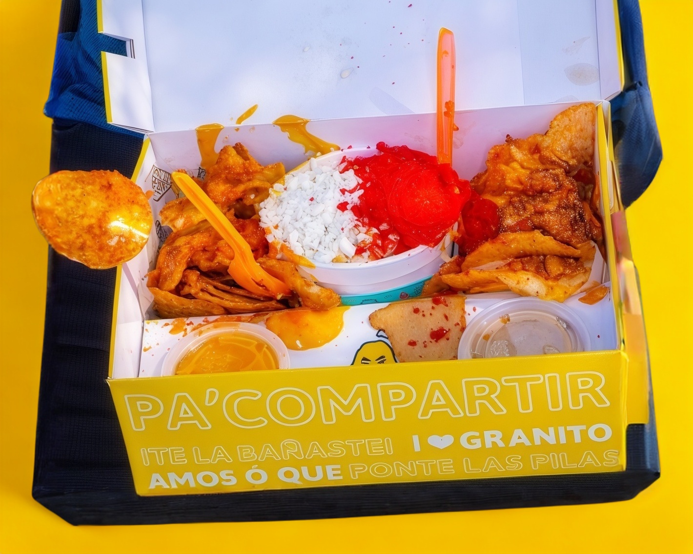 Caja elaborada con dos bolsas de fritos a tu eleccion la cual va acompañada de tres porciones de elote desgranado , ademas puedes agregarle los aderezos y complementos de tu preferencia!