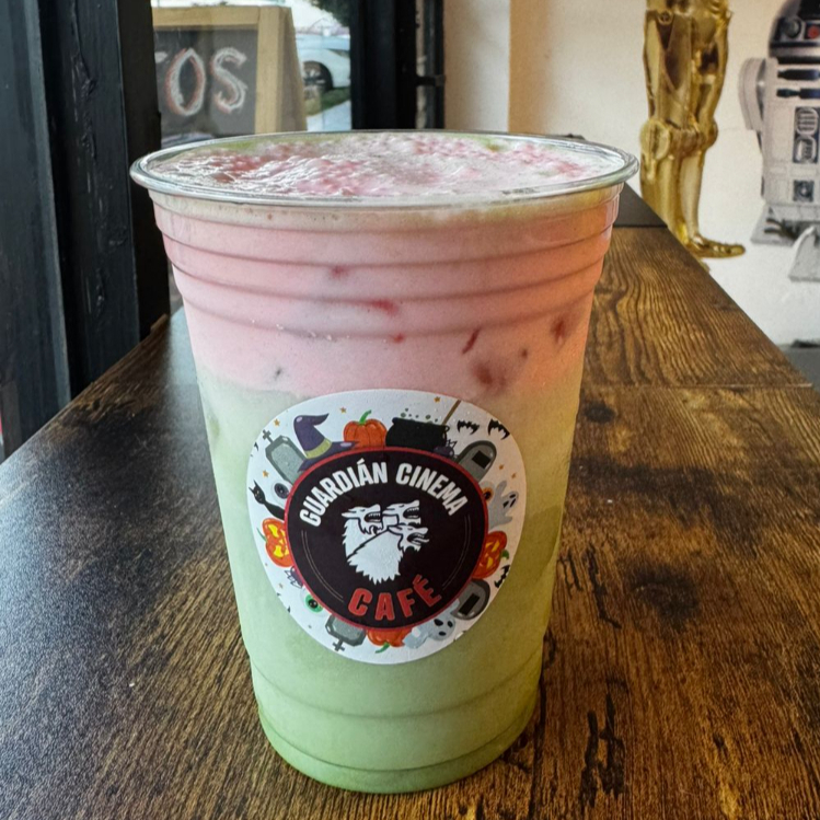 Matcha ceremonial, con la leche de tu preferencia, encima lleva un cold foam de fresa
