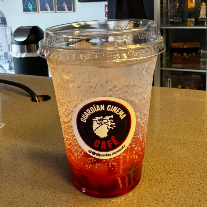 Jarabe de fresa, con perlas explosivas de fresa y agua mineral, una bebida muy refrescante