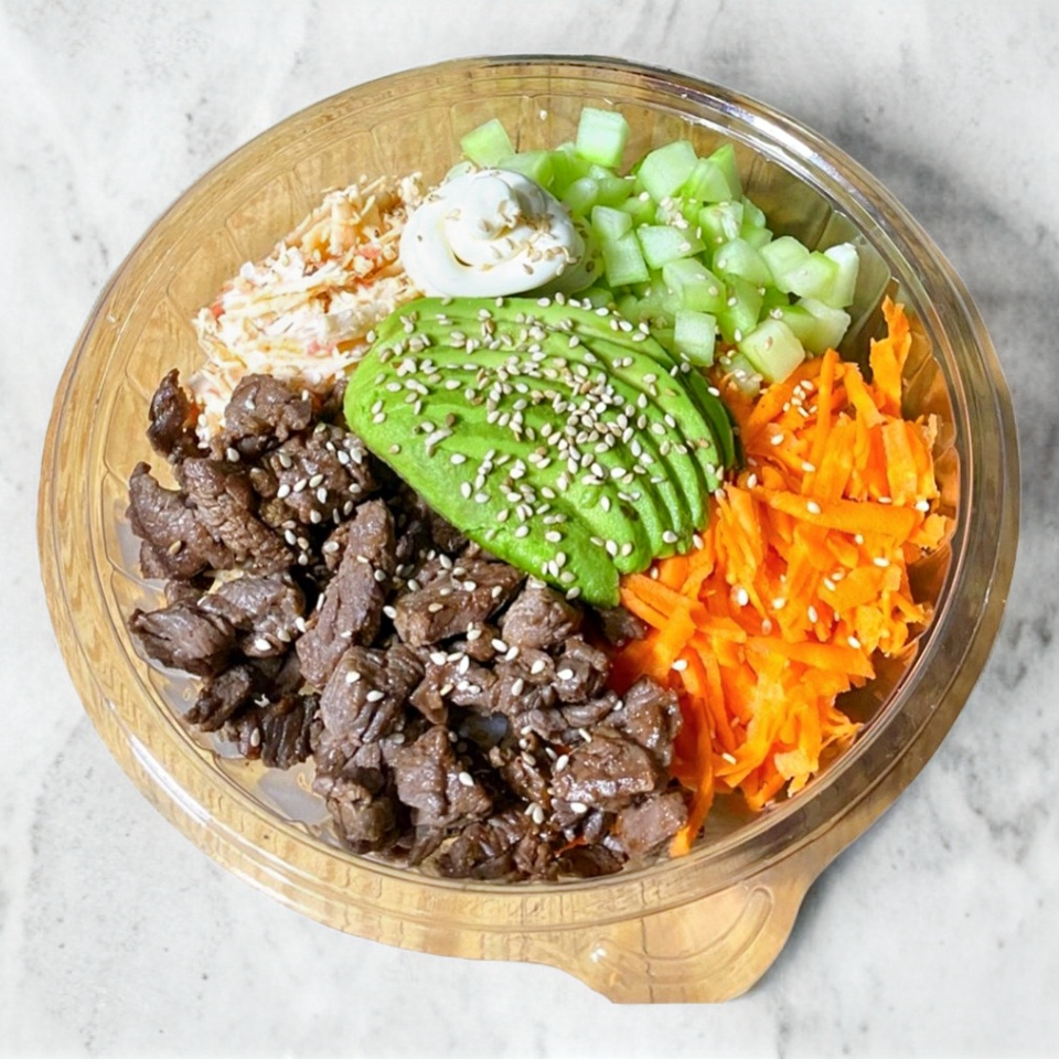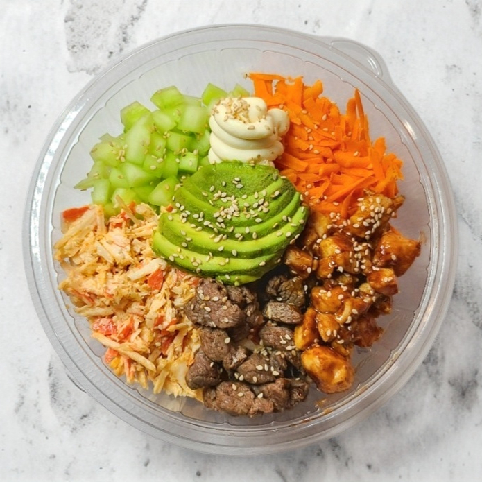 Pollo cocinado con un sazonador especial posteriormente bañado en salsa BBQ, arrachera cocimada con sazonador especial, una base de arroz blanco al vapor, pepino, zanahoria, surimi spicy, rebanadas de aguacate, queso crema y ajonjolí, acompañado con un aderezo chipotle y una salsa de soya preparada.