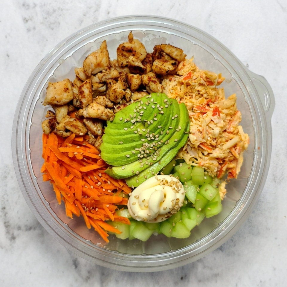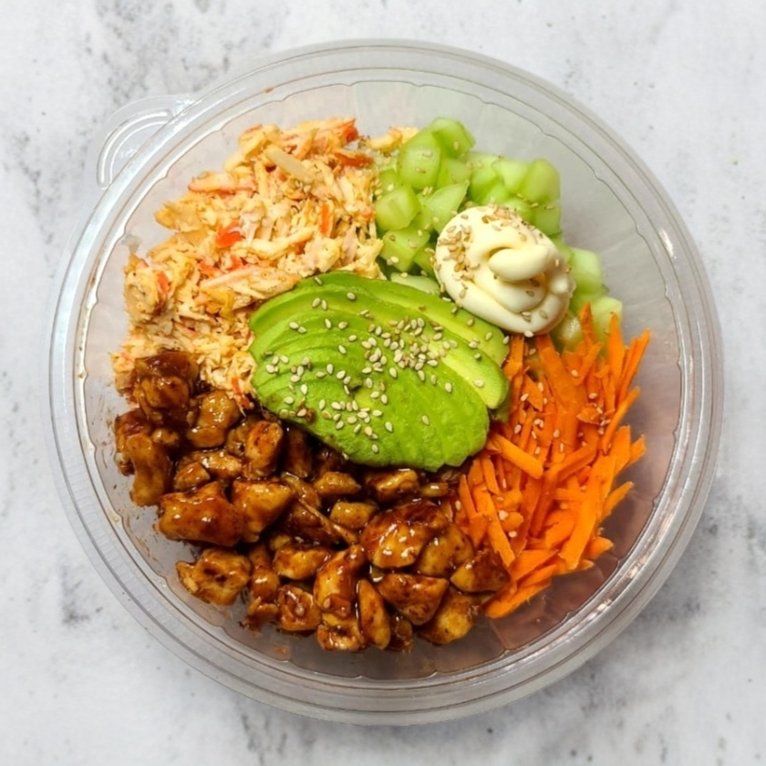 Pollo natural cocinado con un sazonador especial, una base de arroz blanco al vapor, pepino, zanahoria, surimi spicy, rebanadas de aguacate, queso crema y ajonjolí, acompañado con un aderezo chipotle y una salsa de soya preparada.
