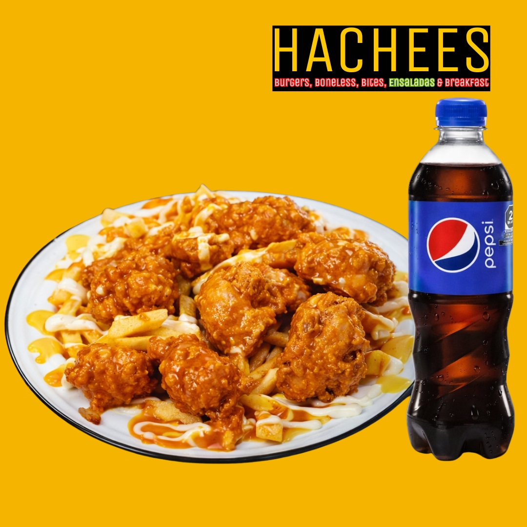 Ocho deliciosos boneless bañados en salsa de tue elección sobre una cama de papas a la francesa bañadas con queso, salsa y aderezo.