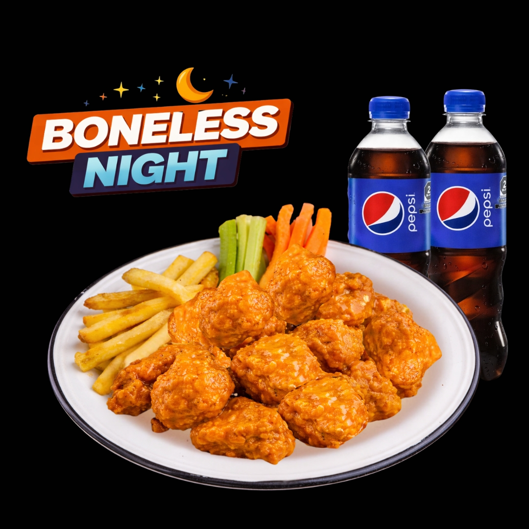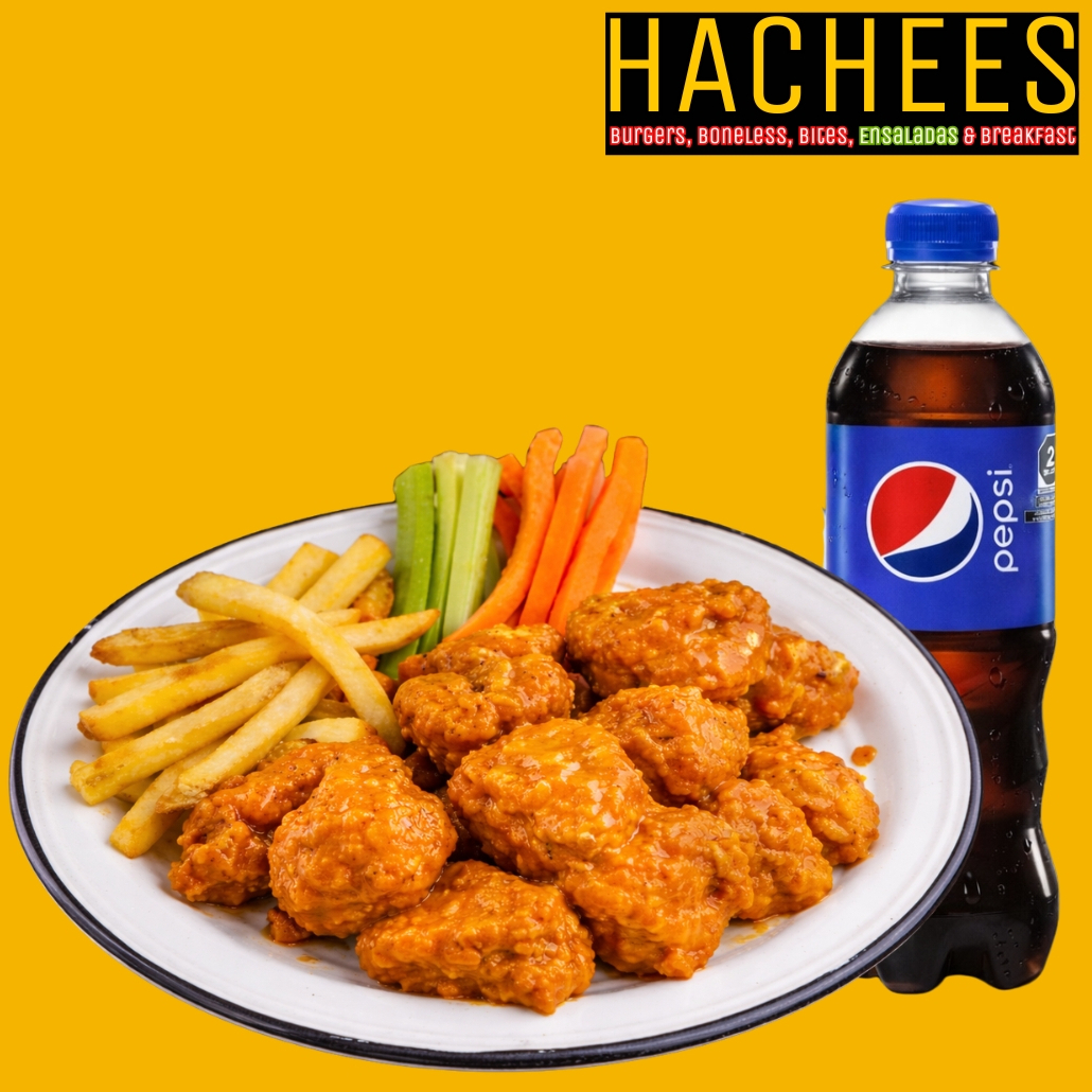 1 kg de boneless bañados en tu salsa favorita acompañados de bastones de apio y zanahoria y 500 gramos de french fries
