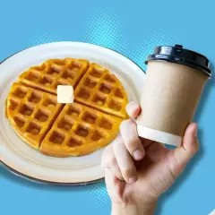Delicioso waffle hecho al momento con 3 tenders, acompañados de mantequilla, un aderezo y miel por separado