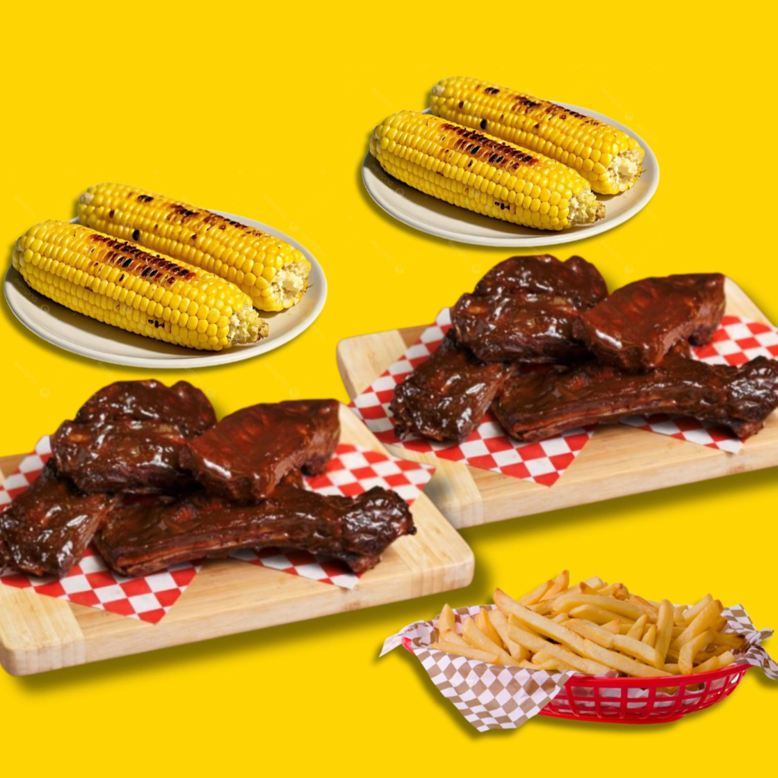 1 kg de costilla bañada en salsa BBQ, 4 elotes con mantequilla sazonados y 500 gramos de papas