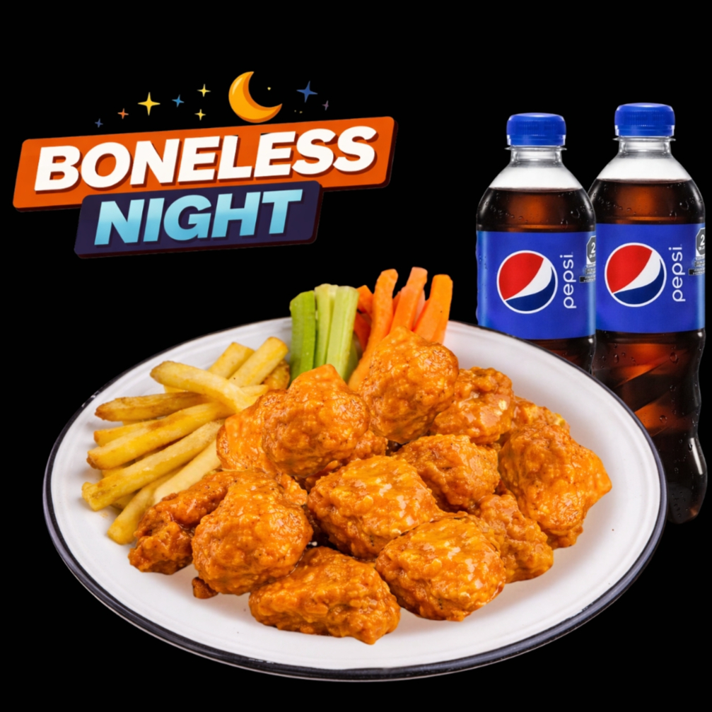 1 kg de boneless bañados en tu salsa favorita acompañados de bastones de apio y zanahoria y 500 gramos de french fries
