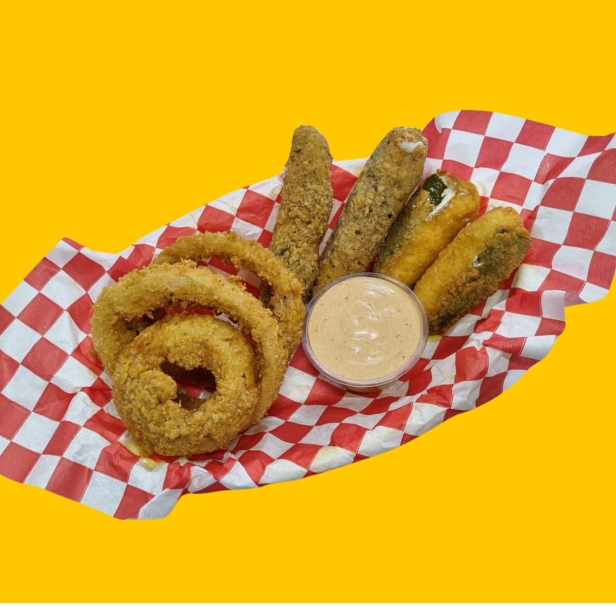 350 gr. de Chicken wings, ocho piezas de onion rigs, seis piezas de boneless, 150 gr. de papas cheese, tres aderezos, bastones de apio y zanahoria.