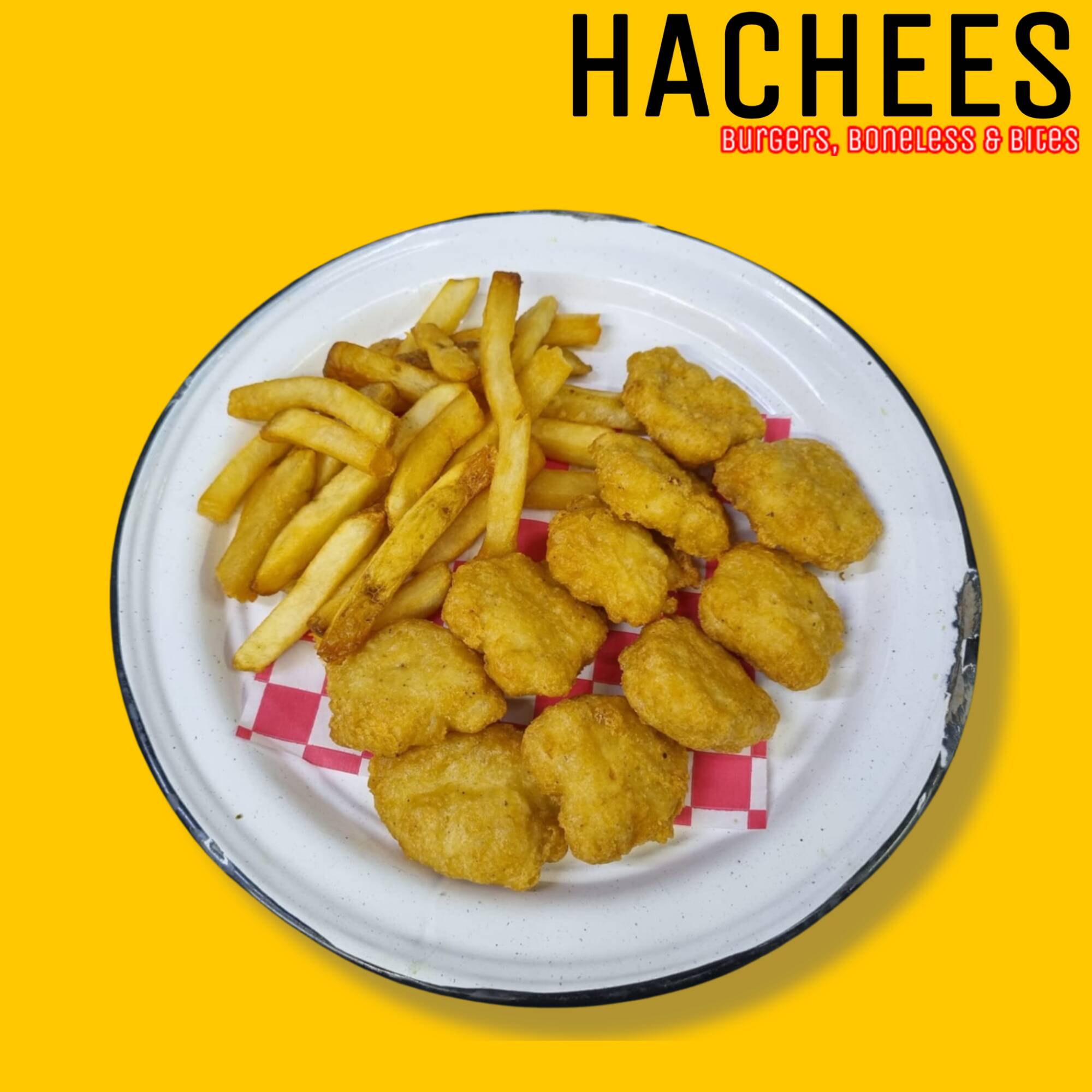 10 piezas de nuggets de pechuga acompañadoa de 150 gr de French Fries