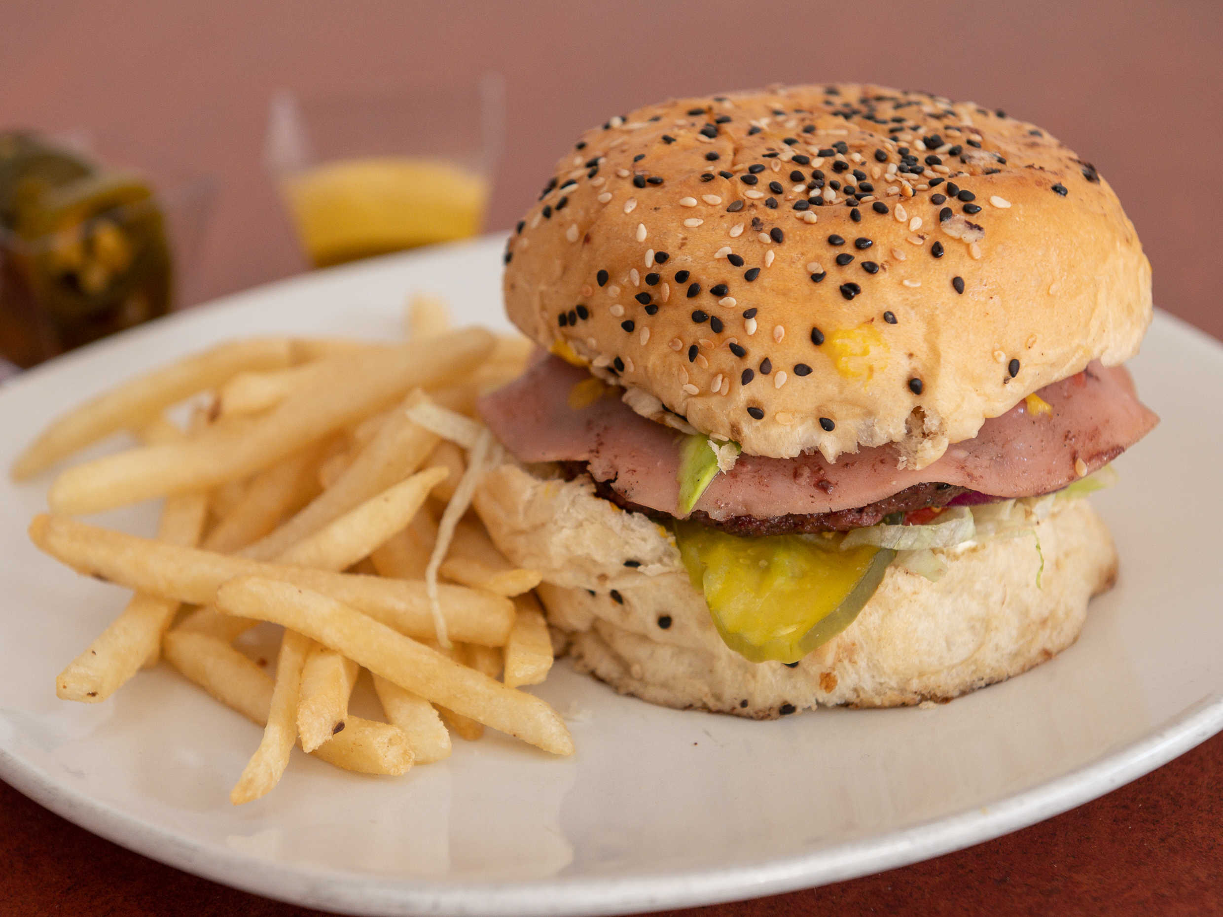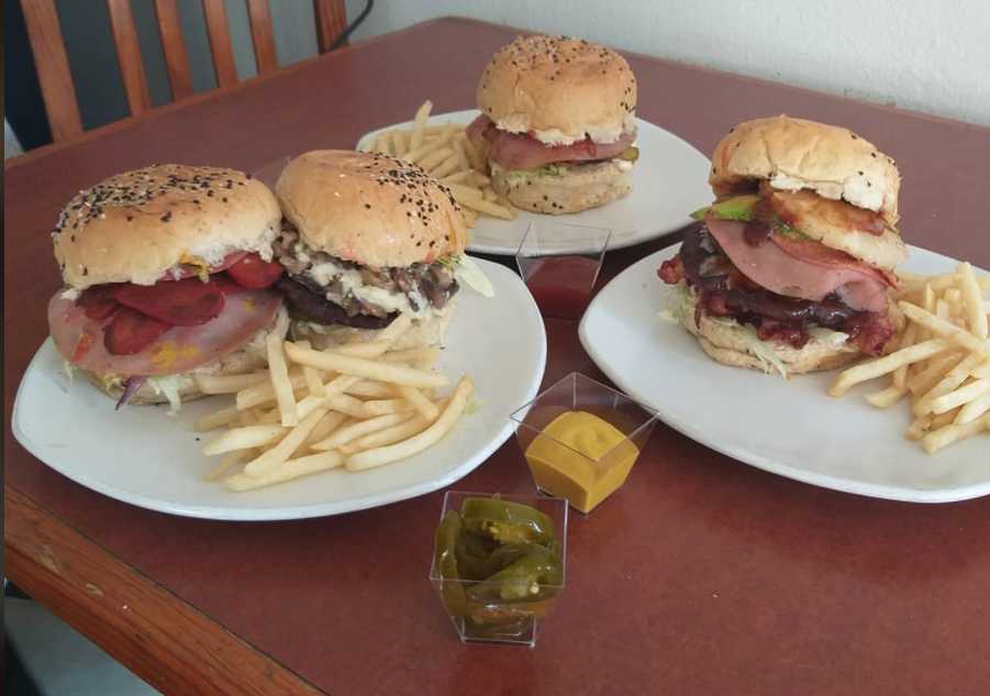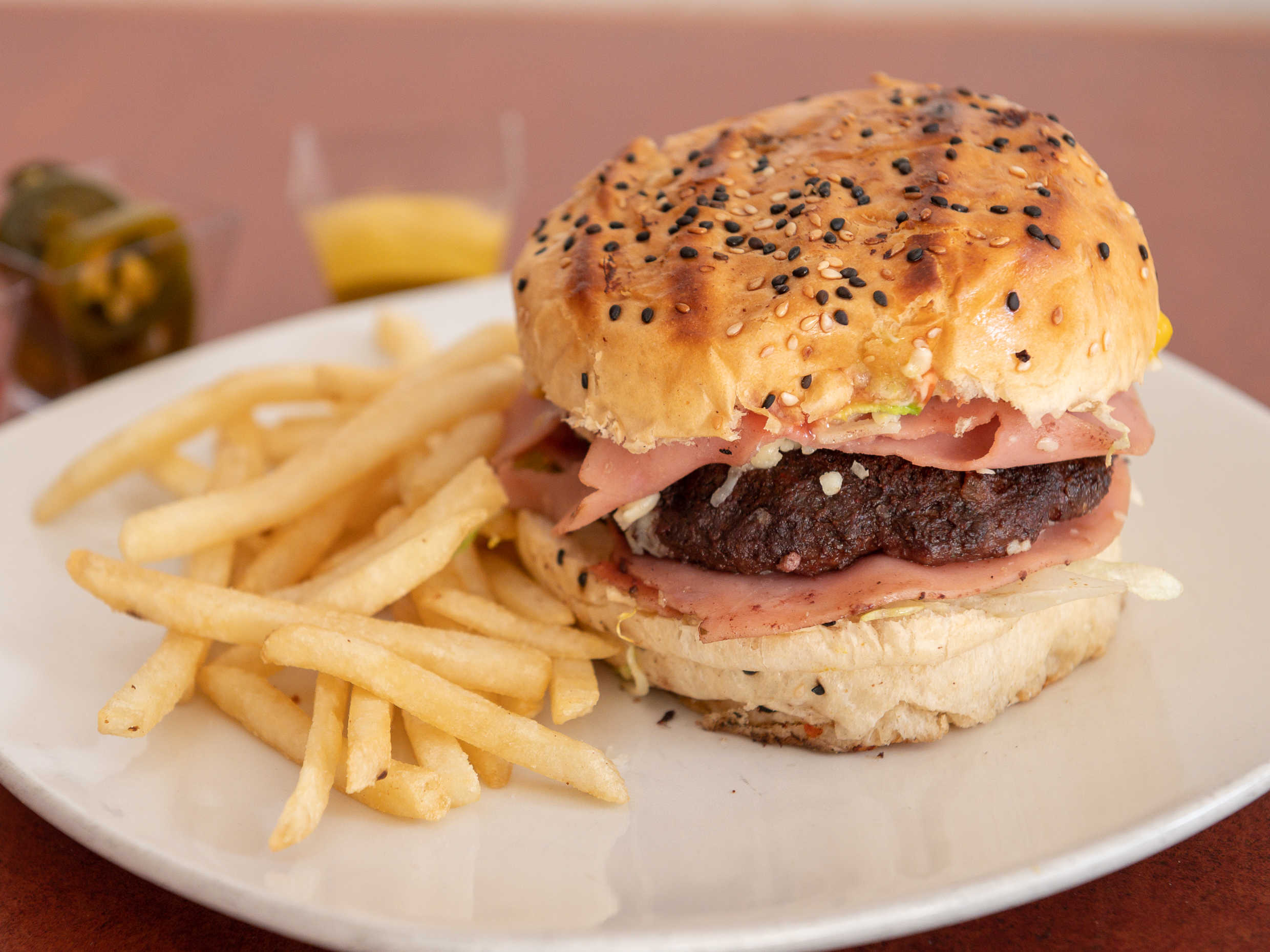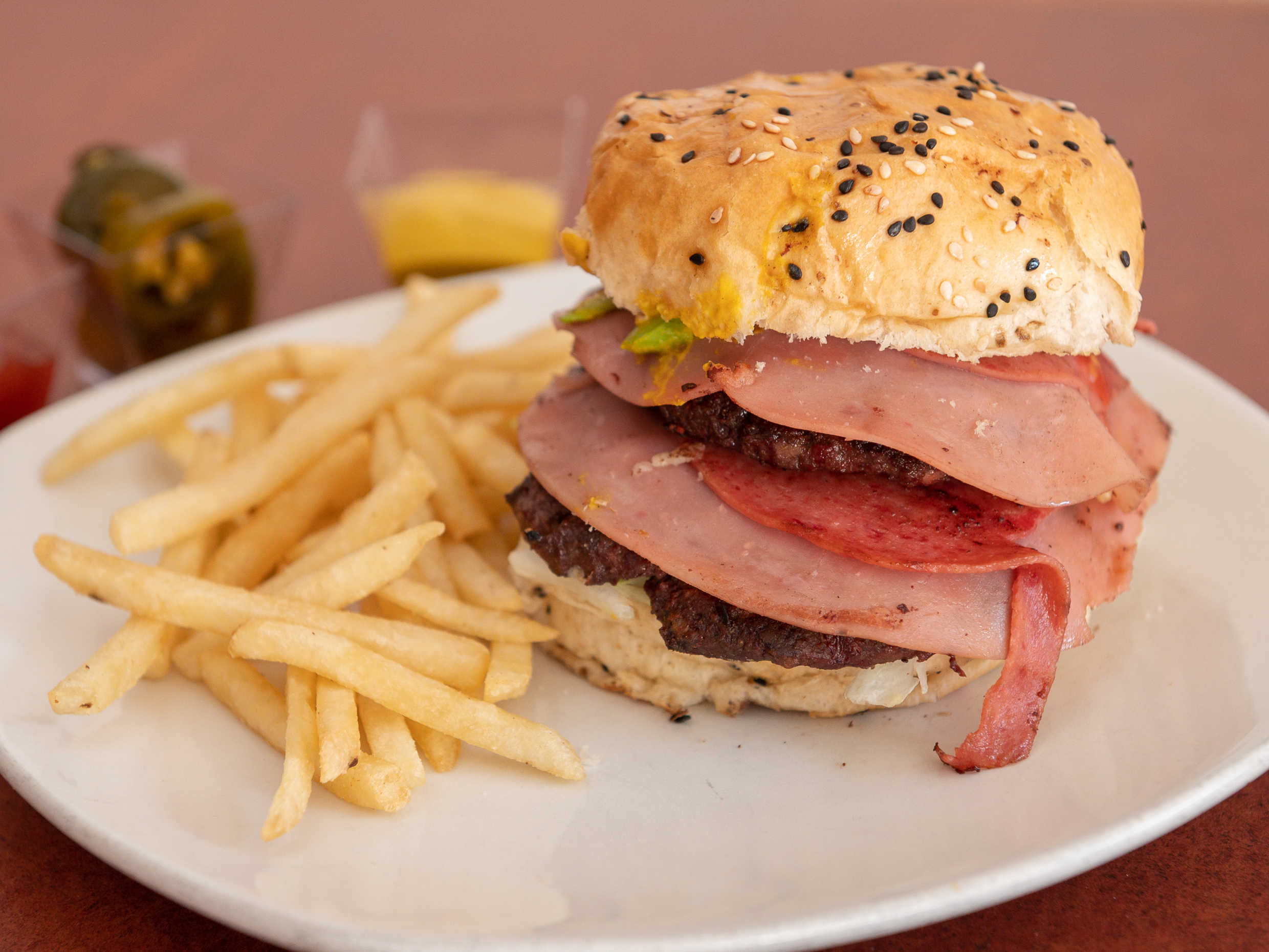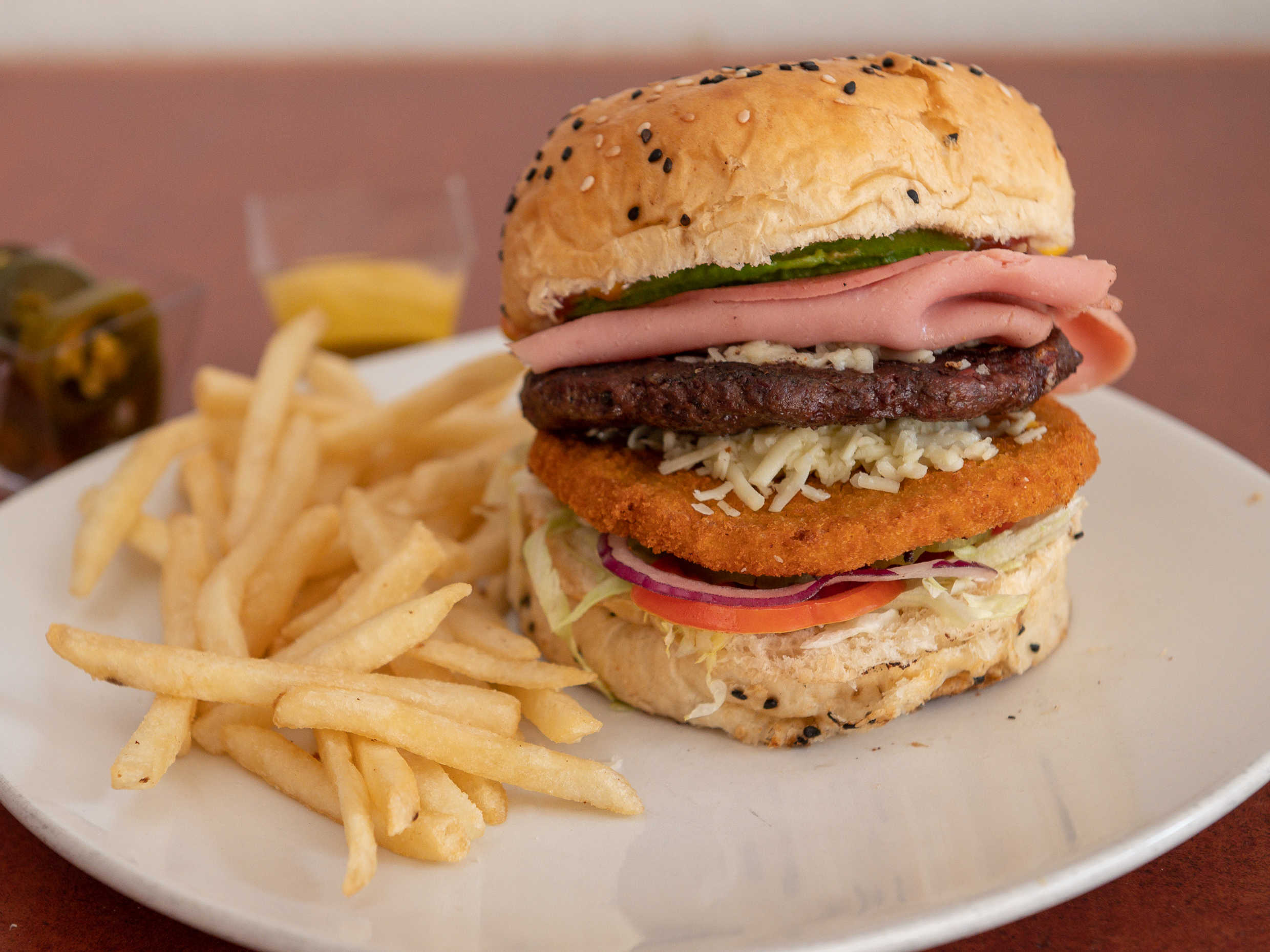 Doble carne, jamón, queso, salami. Ingredientes: lechuga, jitomate, cebolla, pepinillos, salsa cátsup, mayonesa, mostaza y papas a la francesa.