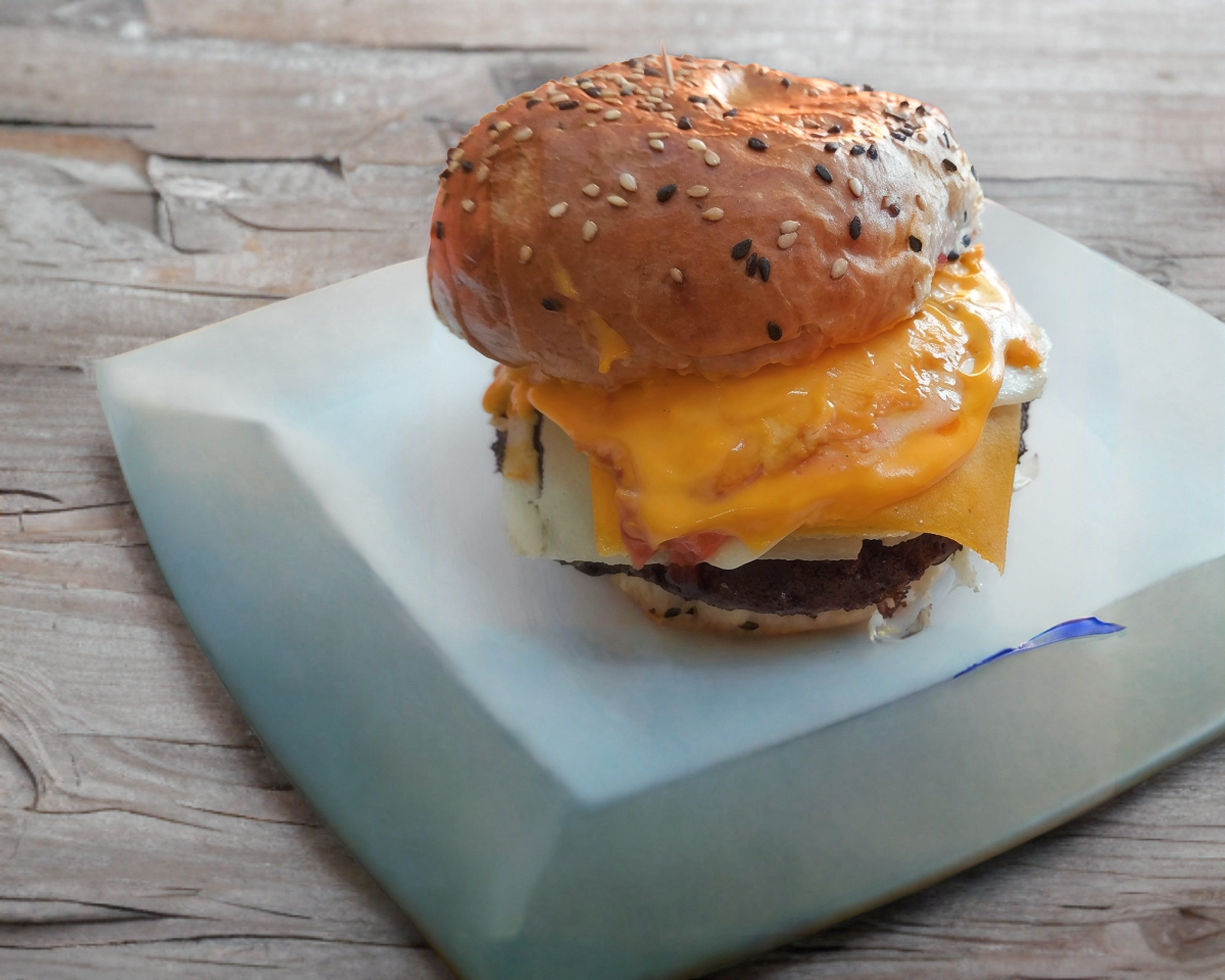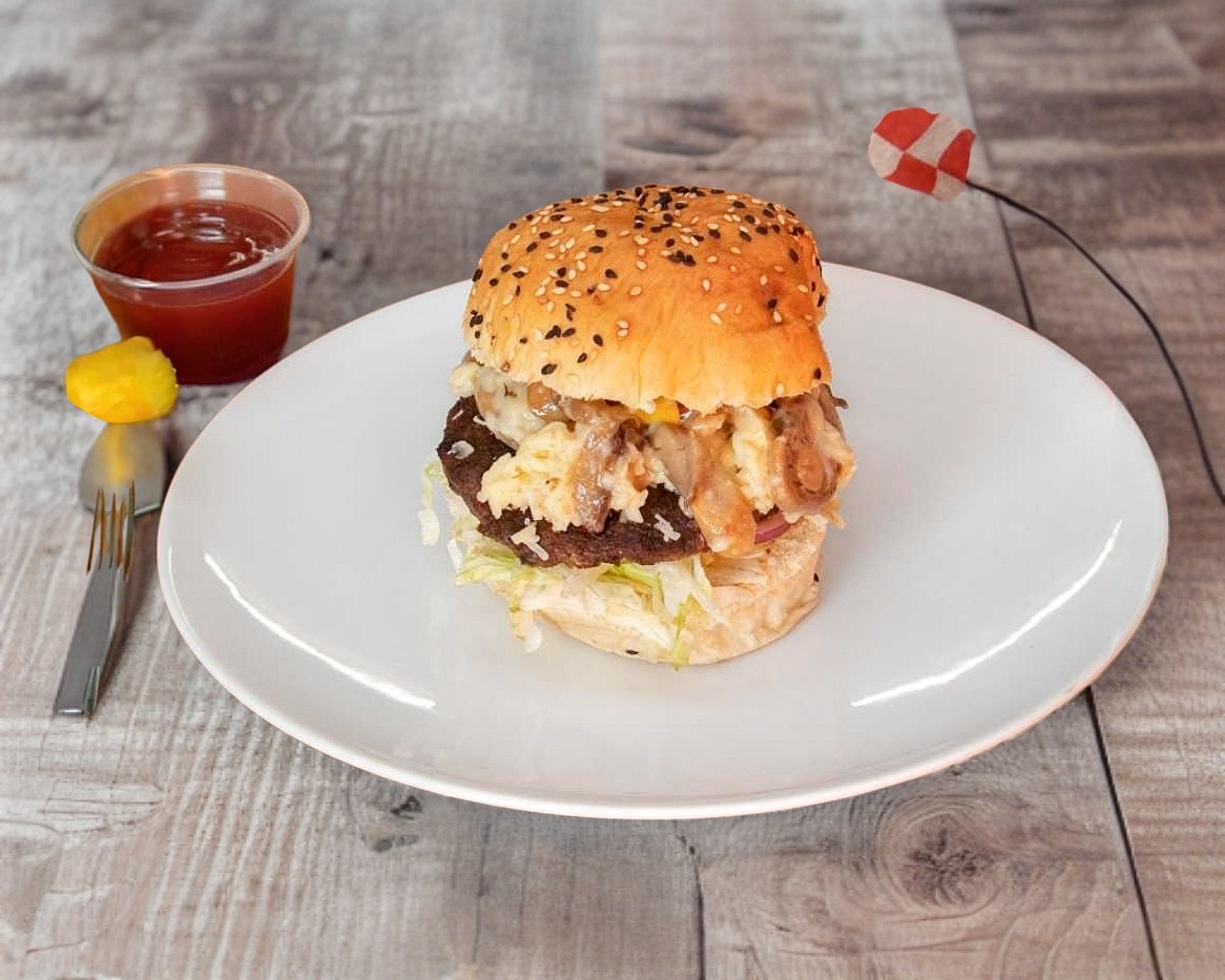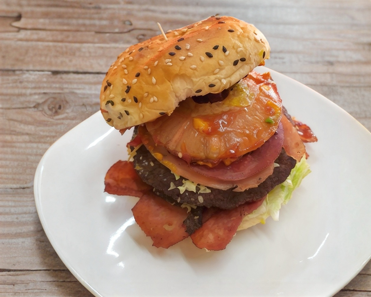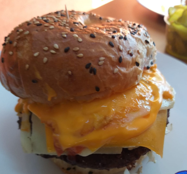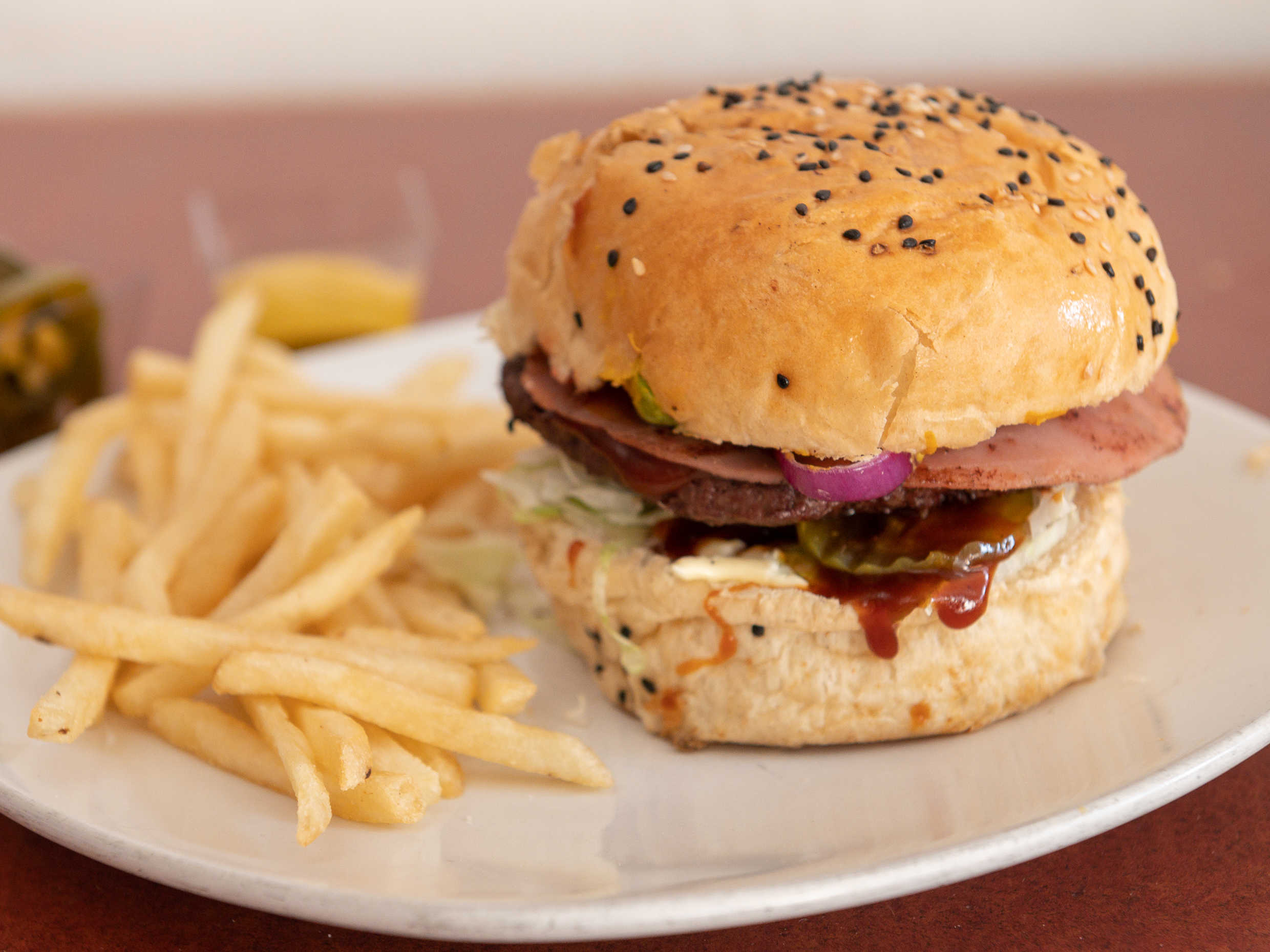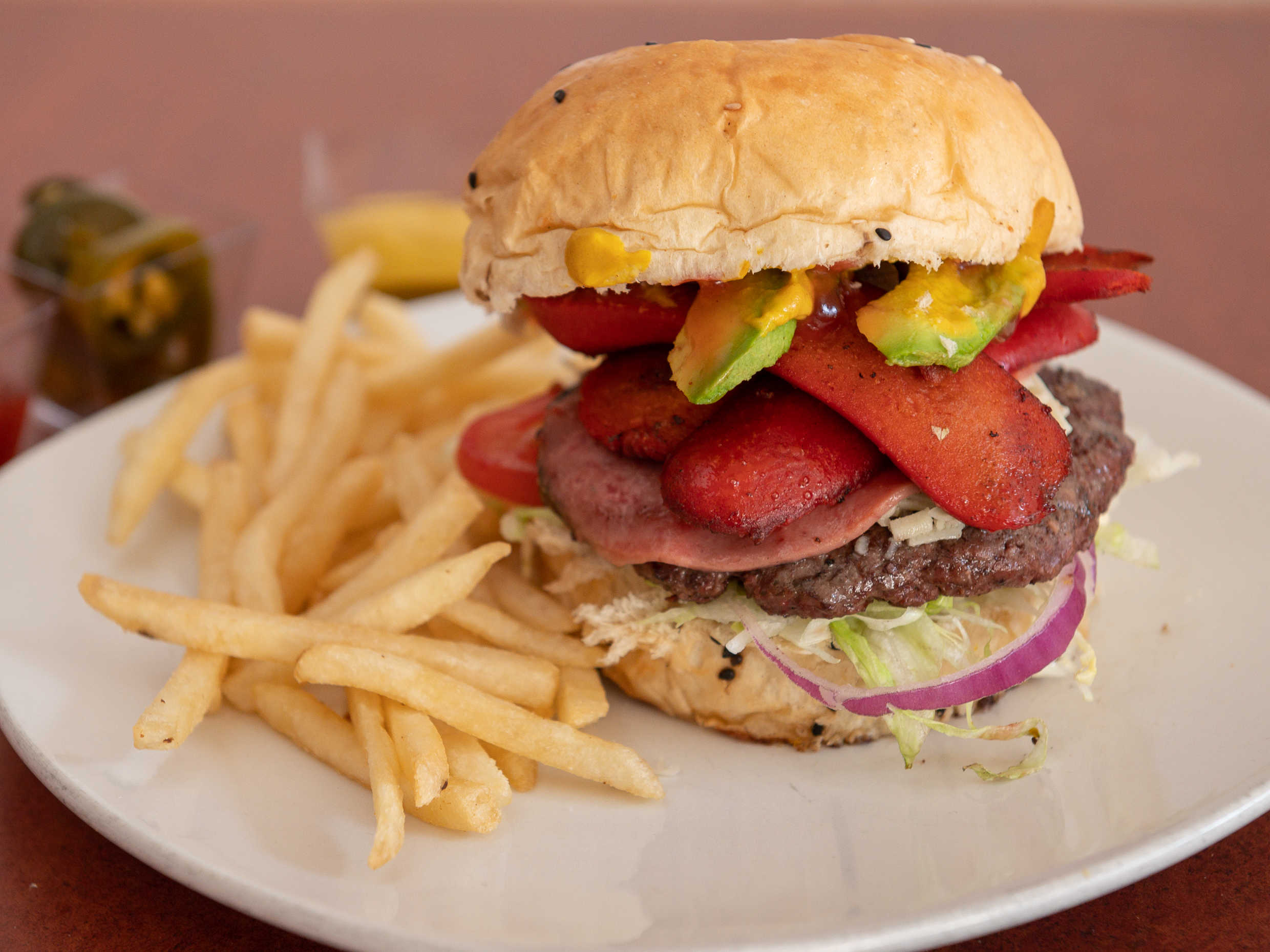 Doble carne, jamón, queso, salami. Ingredientes: lechuga, jitomate, cebolla, pepinillos, salsa cátsup, mayonesa, mostaza y papas a la francesa.