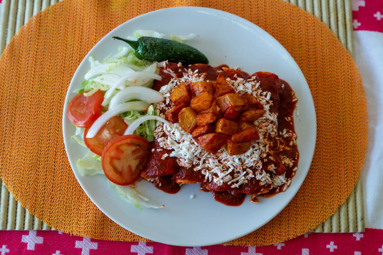 5 piezas de tortilla rellenas de queso panela, bañadas con salsa de adobo y queso panela rayado, acompañada de papa con zanahoria, guacamole, y ensalada