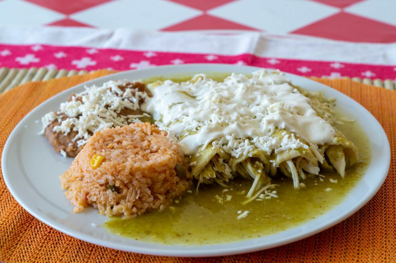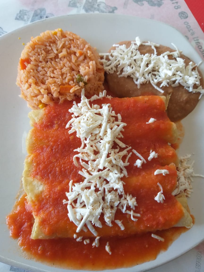 4 piezas de tortilla rellena de pollo desmenuzado, bañadas con salsa , crema y delicioso queso Chihuahua gratinado