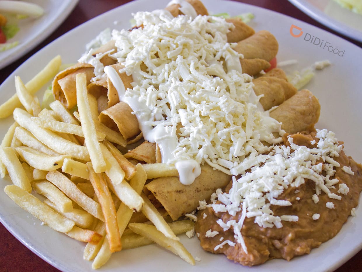 5 piezas de flautas , acompañadas de ensalada , guacamole , crema , salsa y 2 guarniciones a escoger