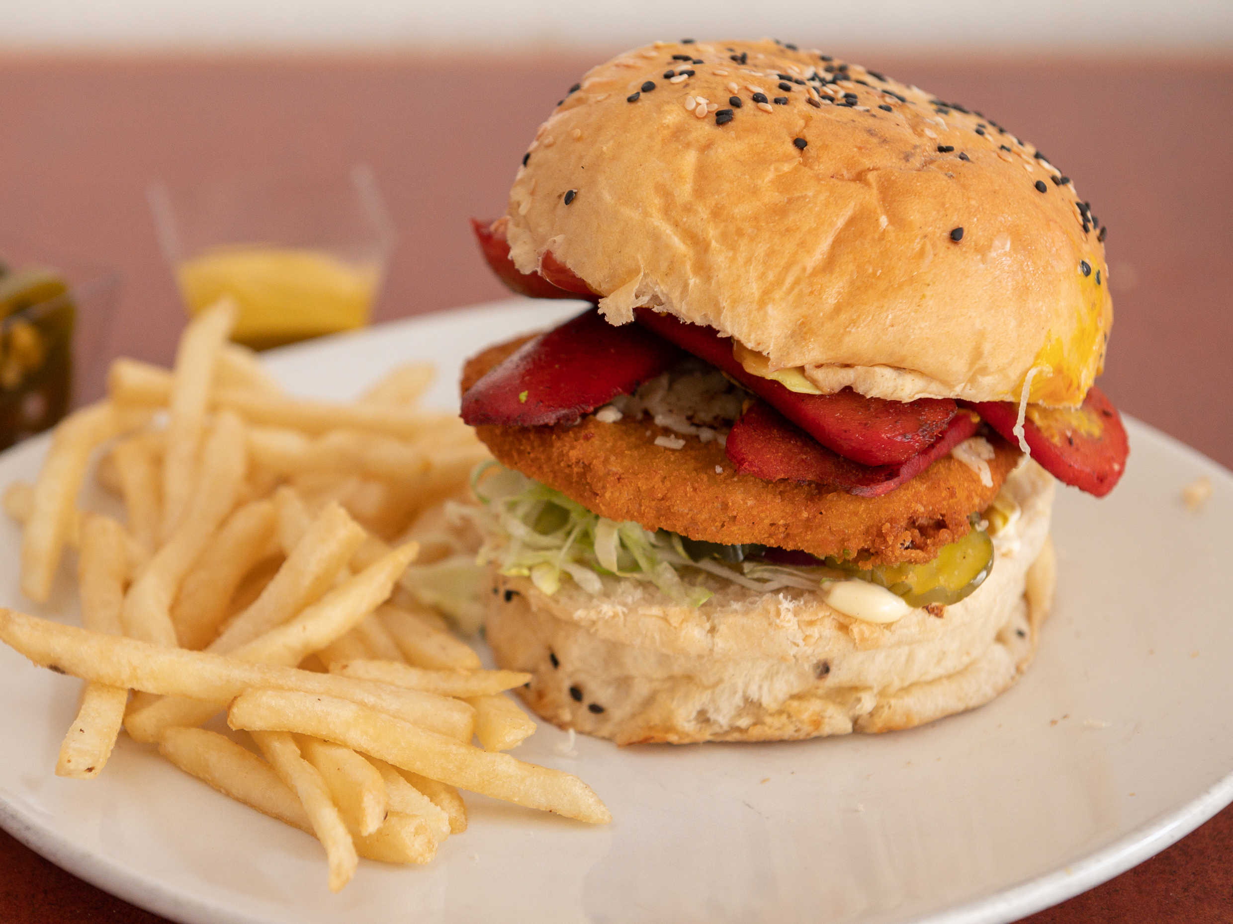 Jamón, queso, salami, lechuga, jitomate, cebolla, pepinillos, aderezo de cátsup, mayonesa y mostaza. Con papas a la francesa.