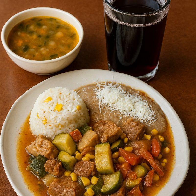 Plato Fuerte + 2 Guarniciones + Sopa de Coditos con Verduras + Agua de Jamaica