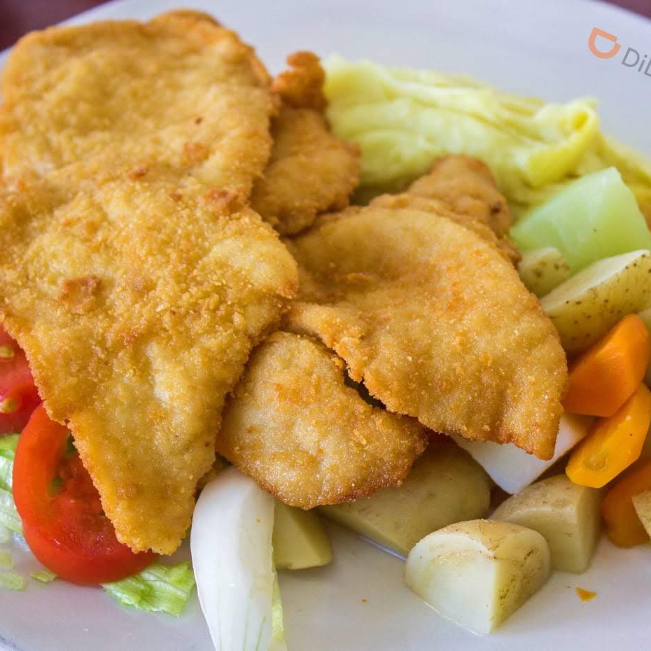 Milanesa empanizada acompañada de ensalada con 2 guaraníciones a elegir, frijol, arroz, puré, spaghetti, verdura cocida, ensalada de nopalitos a la mexicana