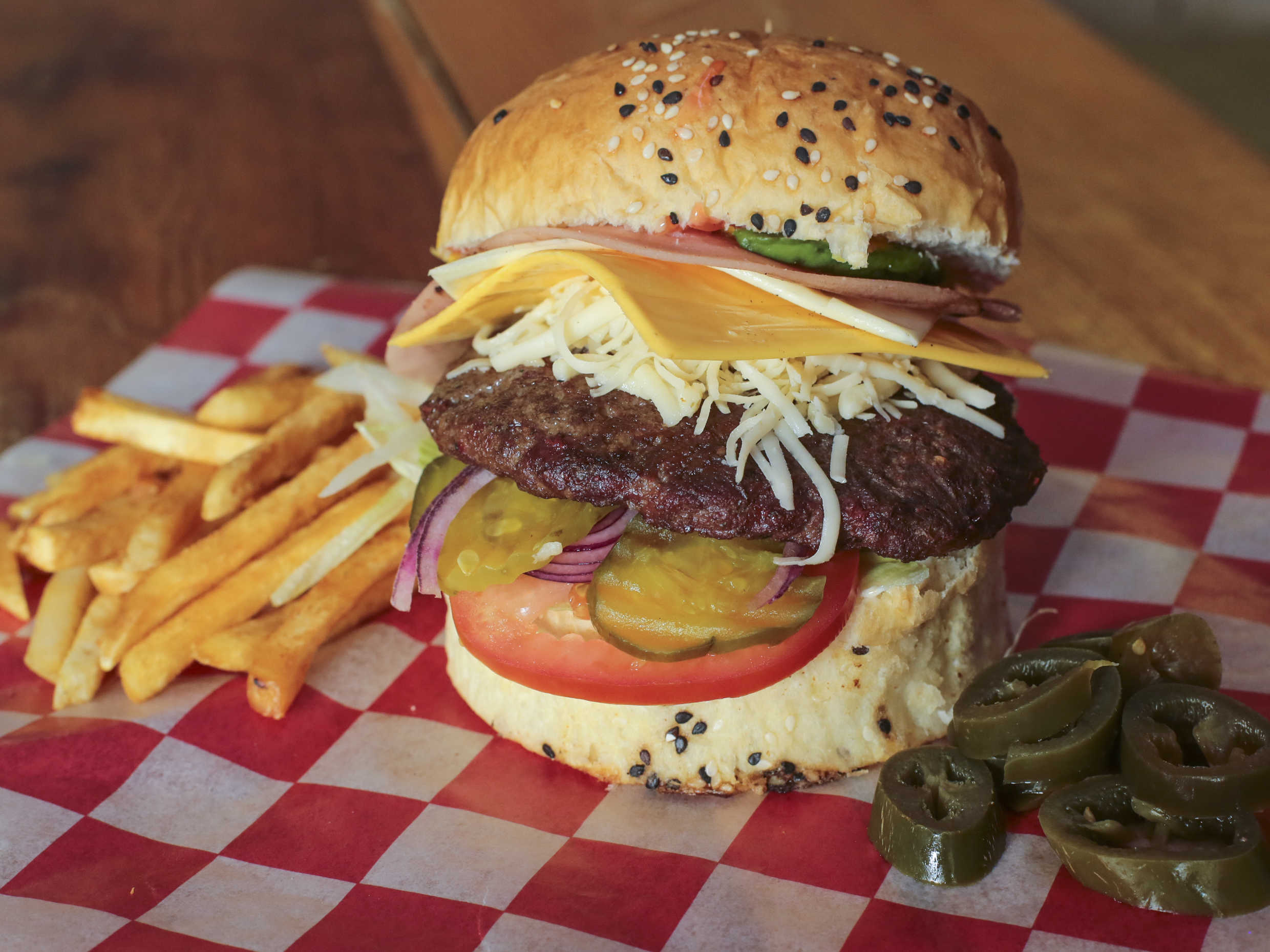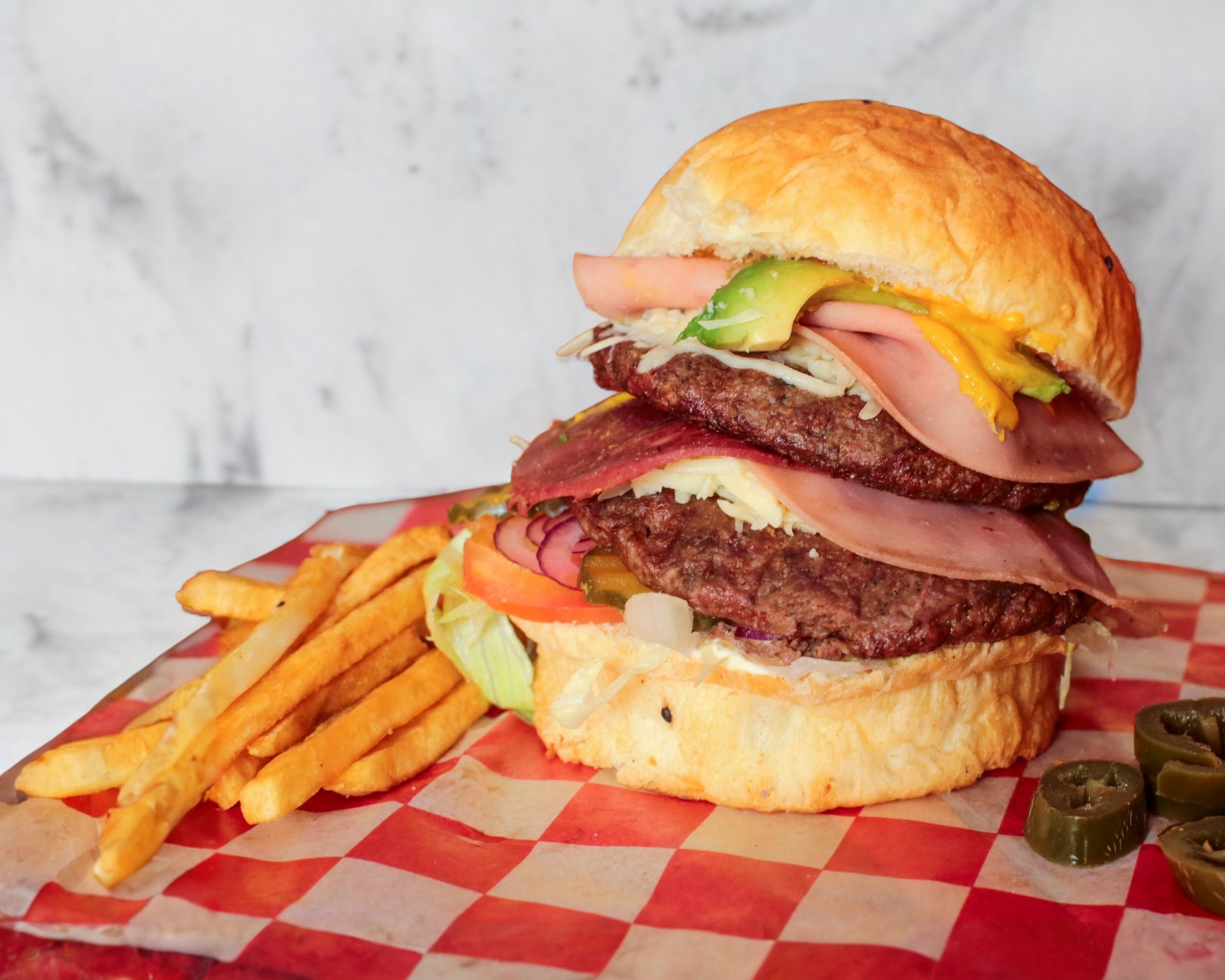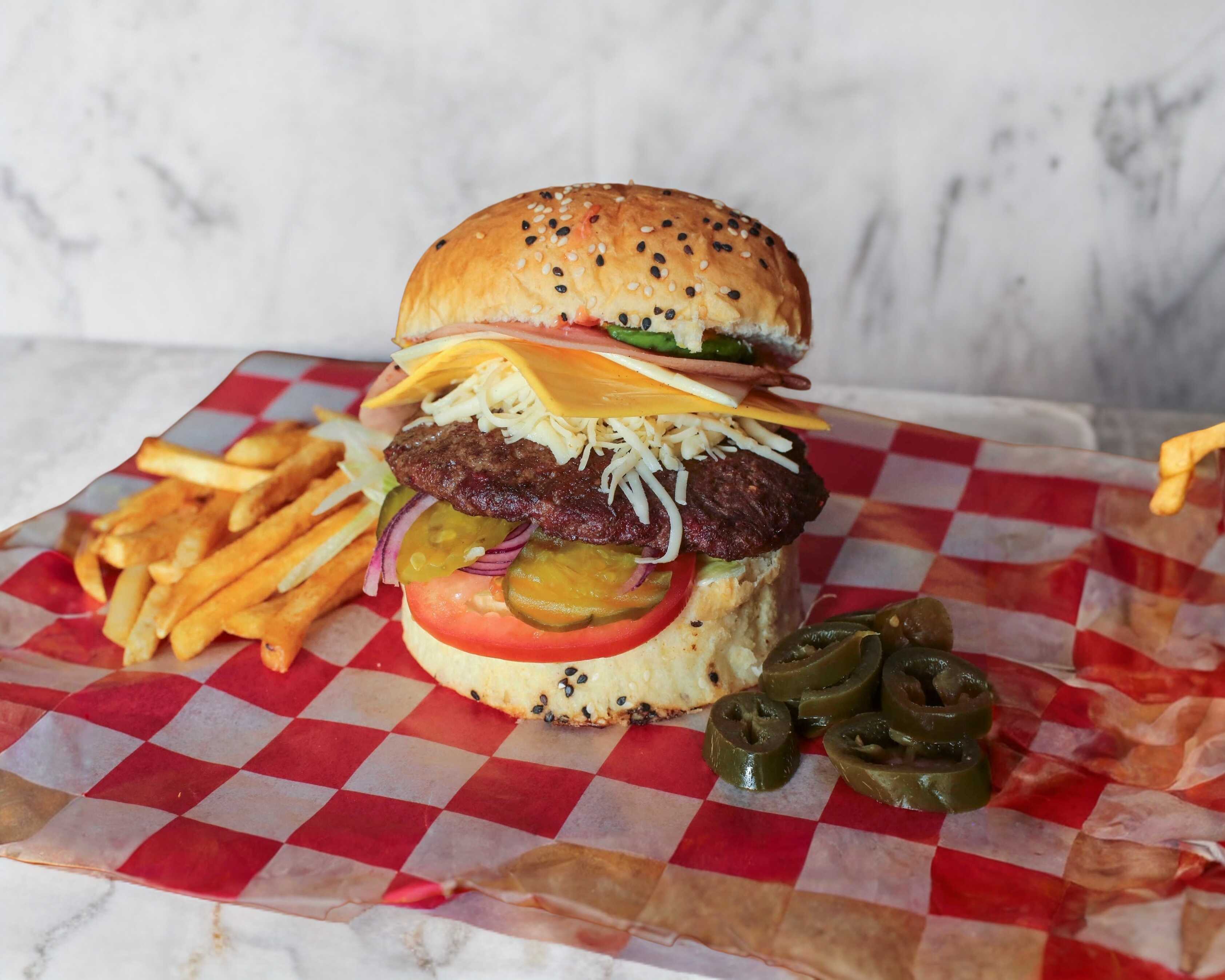 Doble carne, jamón, queso, salami, ingredientes: lechuga, jitomate, cebolla, pepinillos, salsa cátsup, mayonesa, mostaza y papas a la francesa.