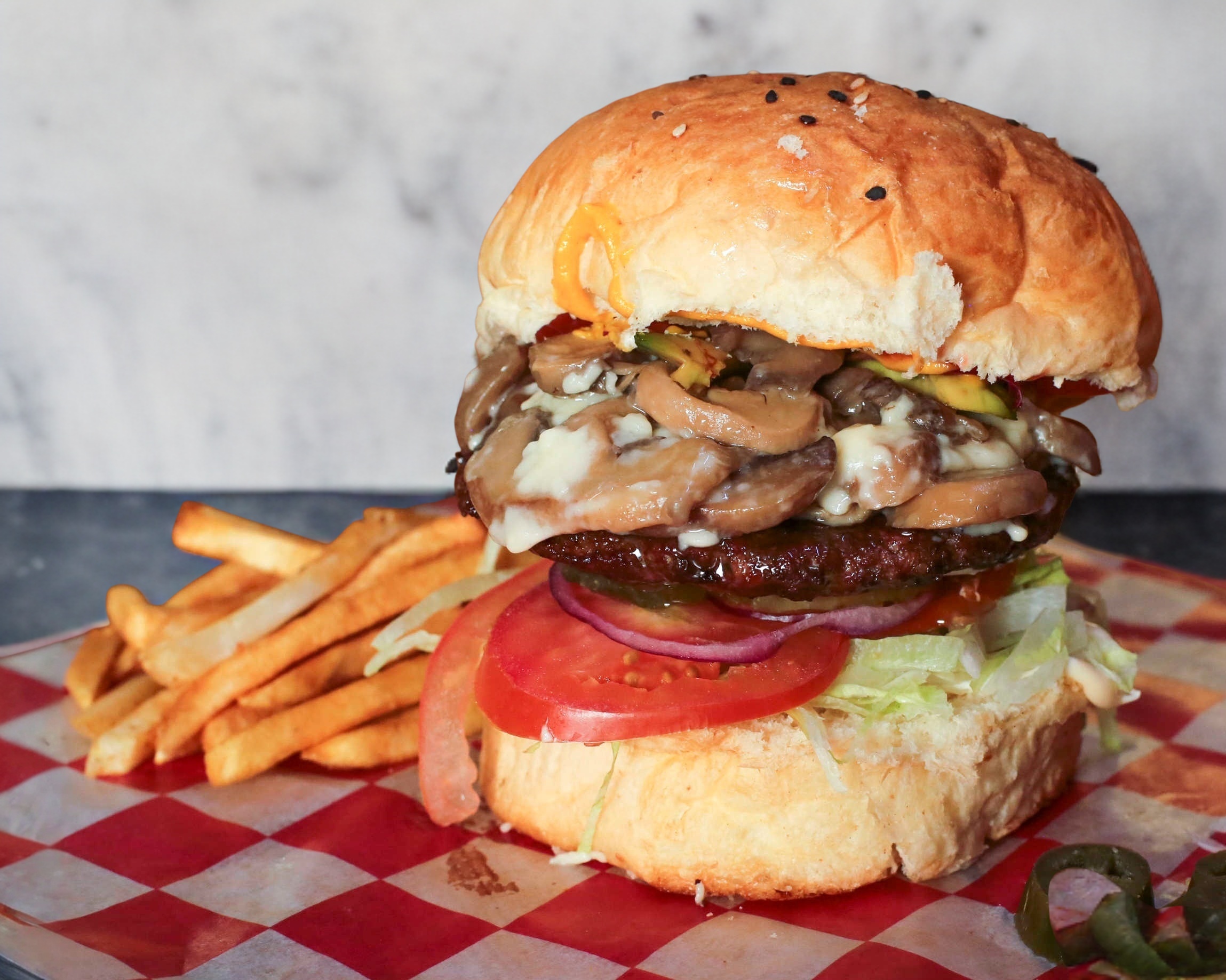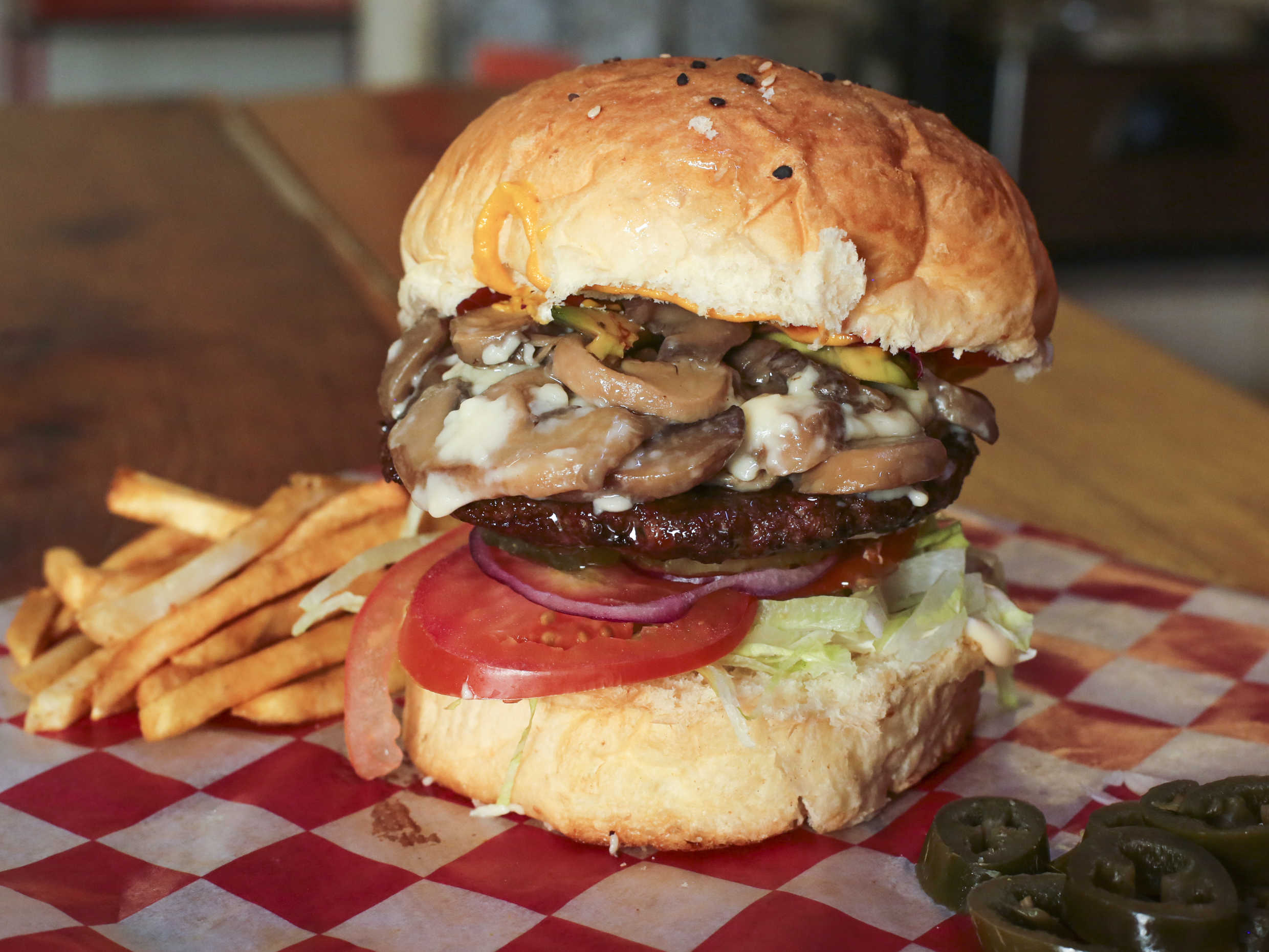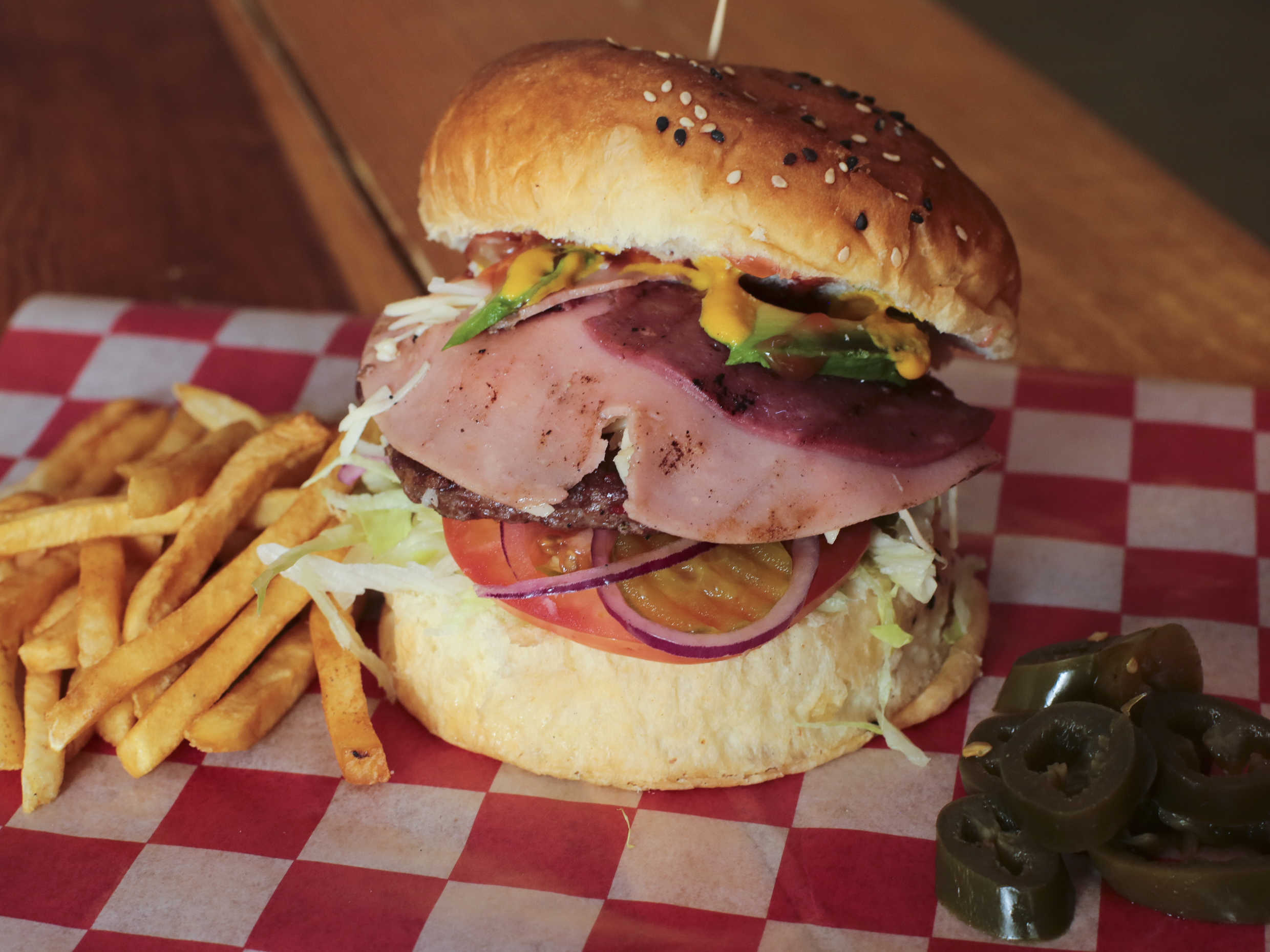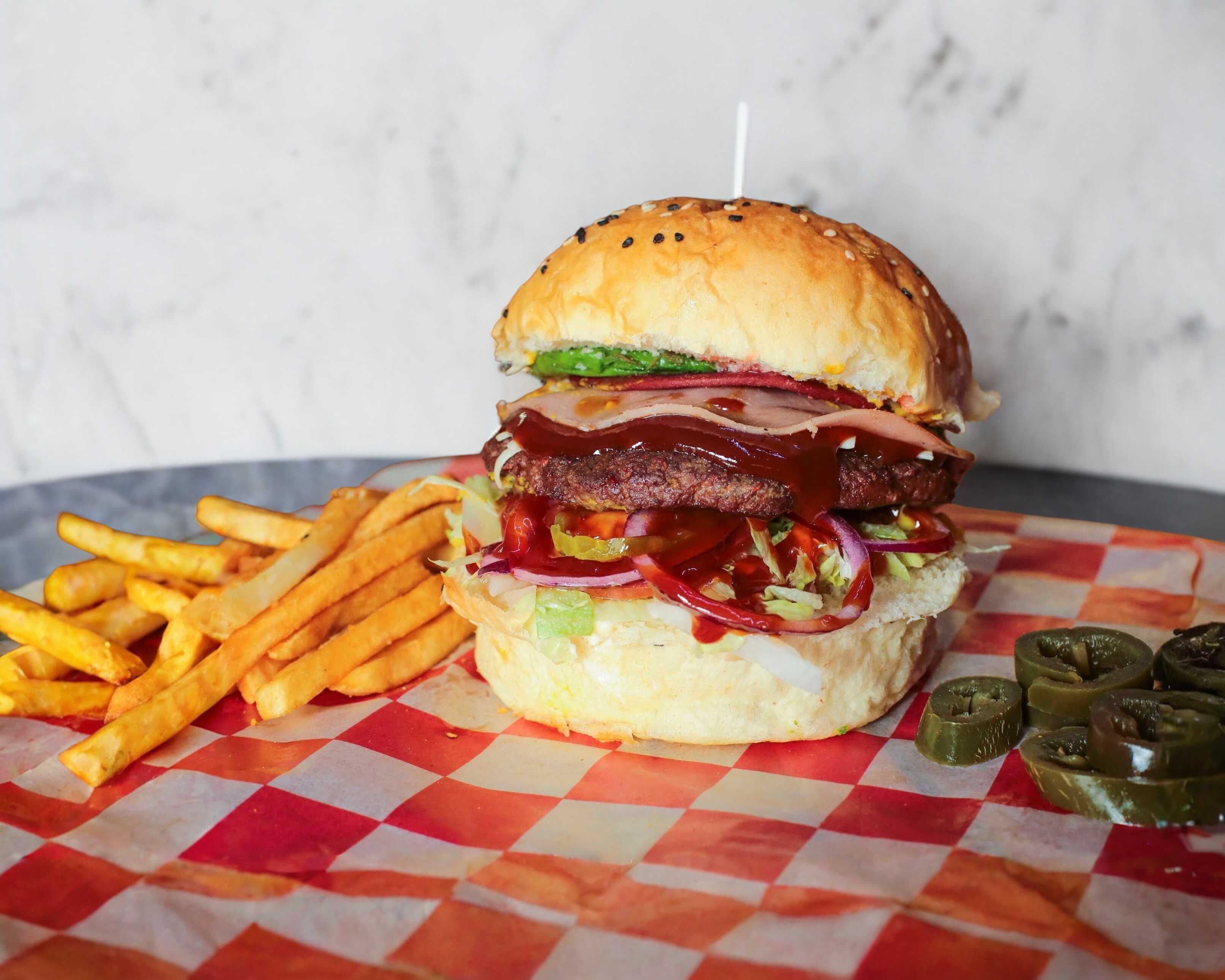 Doble carne, jamón, queso, salami, ingredientes: lechuga, jitomate, cebolla, pepinillos, salsa cátsup, mayonesa, mostaza y papas a la francesa.